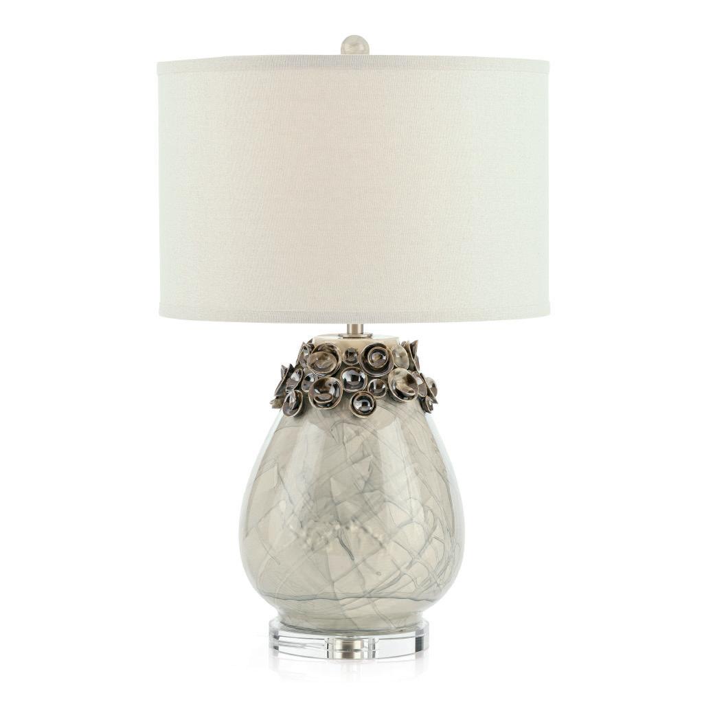 JRL-11328 (Porcelain Blooms Table Lamp): The Porcelain Blooms Table Lamp features a glazed porcelain body hand-painted with soft grey flourishes that drift across its curved surface. Dimensional clusters of hand-sculpted florals adorn the neck, presenting natural motifs through a contemporary lens. Polished Nickel hardware and a round crystal base elevate the look with a refined touch of modern sophistication. This piece is topped with a matching ceramic ball finial and a white linen drum shade with rolled edges, completing the look. 27” H x 17” W x 17” D