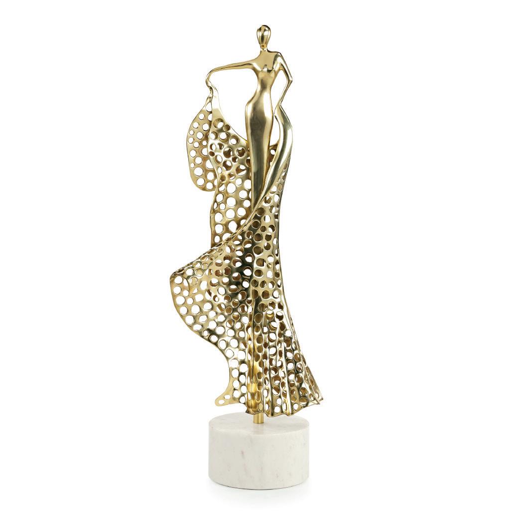 JRA-15984 (Evangelina Sculpture on Marble): The Evangelina Sculpture is a breathtaking, 53” tall, statement piece that commands attention within a space Crafted from Polished Brass, the design showcases a tall, elegant figure holding a flowing veil with textural perforations. This sculpture gracefully stands atop a rounded marble base. 53” H x 19” W x 14” D