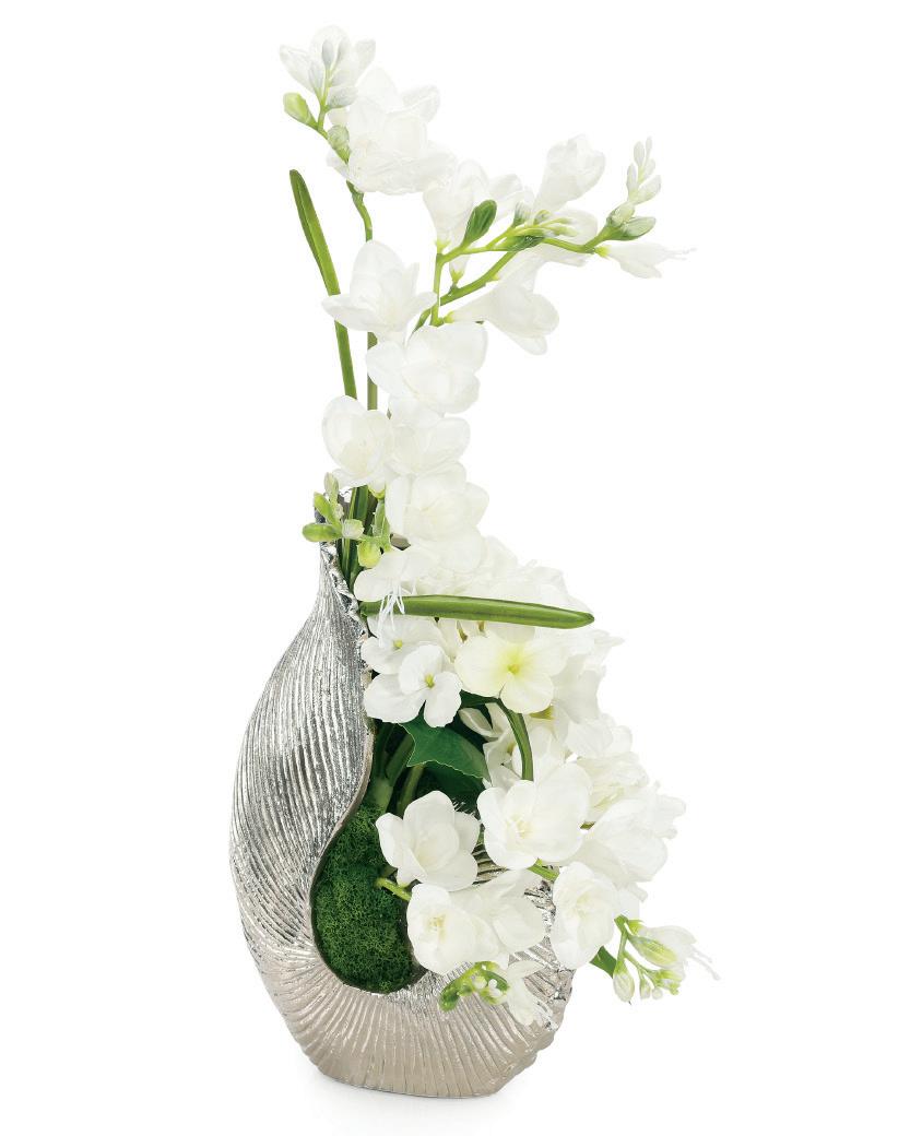 JRB-5660 (Nautilus Clouds): Nautilus Clouds showcases freesia stems and delicate spray of white hydrangeas accented with natural green reindeer moss The arrangement is housed within our Nautilus Seashell Sculpture, introducing ornate tones and an irresistible coastal theme 22” H x 11.5” W x 9” D