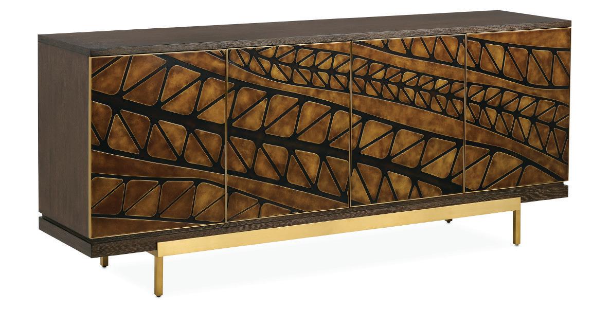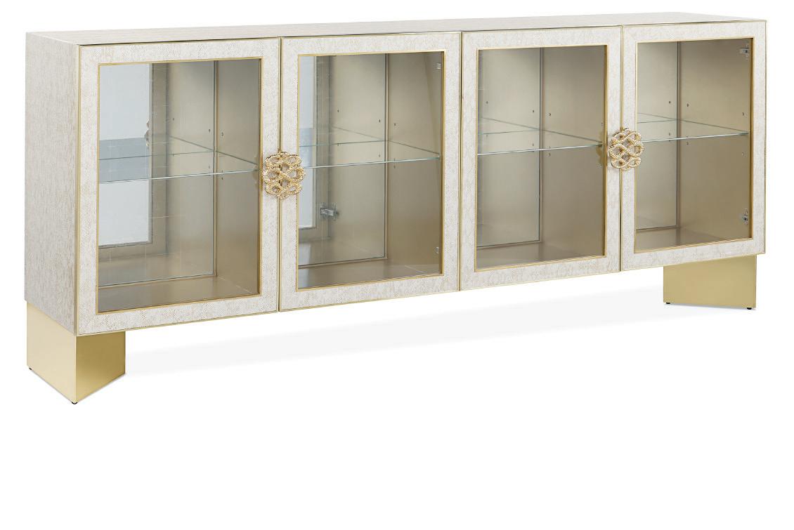 EUR-04-0886 (Celtic Four-Door Sideboard): The Celtic Four-Door Lighted Sideboard is a study in texture and form, defined by luminous materials and intricate craftsmanship. Wrapped in tactile faux snakeskin over quarter celtis veneer, its surface exudes elegance and rich visual depth . Polished Brass trim outlines the base and doors with tailored precision, while matching serpentine handles with hammered detailing contribute a bold, sculptural touch. Four interior compartments in a Paris finish feature tempered glass windows, adjustable shelving, and stylish églomisé back panels that gracefully reflect the interior LED lighting. 36.5” H x 88” W x 18.5” D