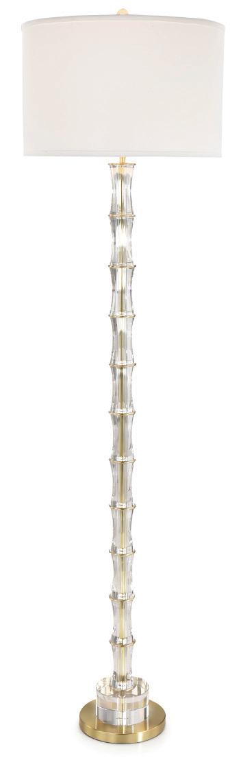 JRL-11168 (Crystal Bamboo Floor Lamp): The Crystal Bamboo Floor lamp is crafted from clear crystal, showcasing a gorgeous, rippling silhouette with Brushed Brass detailing that evokes the natural curvature of bamboo A matching two-tiered base of crystal and brass introduces angular contrast to the rounded body The piece is topped with Polished Brass hardware, a matching crystal finial, and a white linen shade with rolled edges. 72” H x 20” W x 20” D