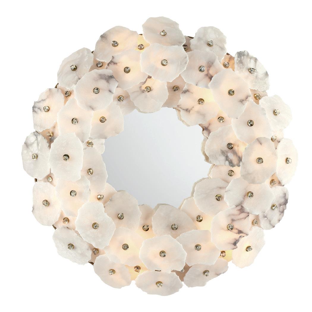 JRM-1598 (Montserrat Fourteen-Light Mirror): The Montserrat Mirror is a stunning blend of organic materials and contemporary style The frame is adorned in a cluster of layered natural alabaster affixed with brass accents, displaying rich textural forms that create a bold dimensional statement. The mirror features support for up to fourteen lightbulbs, not included with purchase. 55.5” W x 5.5” D