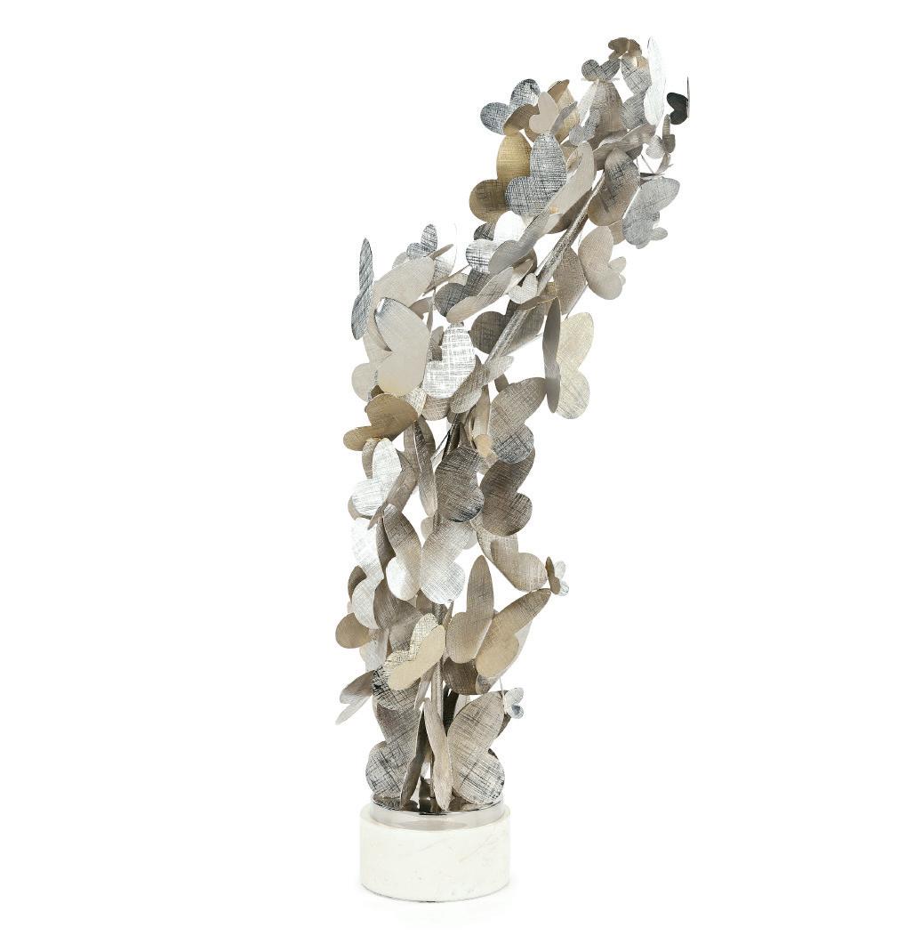 Sculpture is a tribute to one of Mother Nature’s most delicate, majestic creatures Crafted from brass in Nickel and Champagne tones, this two-toned sculpture showcases a dense cluster of hand-textured butterflies. The butterflies rest upon a rounded base of natural white marble.