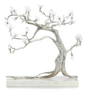 JRA-15983 (Sakura Sculpture on Marble, Nickel): The Sakura Sculpture is a gorgeous celebration of nature’s beauty. Crafted from brass in a Nickel finish, the piece evokes the appearance of a stunning sakura tree adorned with clear glass flower buds. This tranquil design statement rests atop a rectangular base of white marble. 31” H x 27.5” W x 15”D