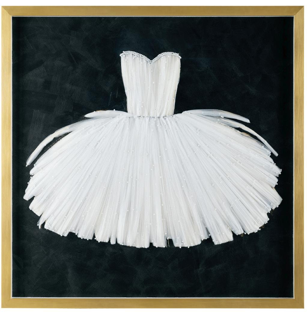 GBG-3110 (Kristine Hegre’s Ballet Tutu): Ballet Tutu by Kristine Hegre is an elegant print on watercolor paper with a gel finish, depicting a graceful tutu in soft, flowing form. Hand-applied tulle fabric enhances the composition with beautiful dimension and texture, as the tutu’s delicate ripples bring a sense of movement and refinement to any space. 46.37” W x 46.37” H x 2” D