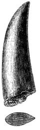 tooth of the Mosasaurus; from the latter, however, even fragments may be known by the presence of longitudinal ridges. The animal itself was an enormous marine reptile, allied to the Plesiosaurians, but more nearly related to the Crocodilians.[598]