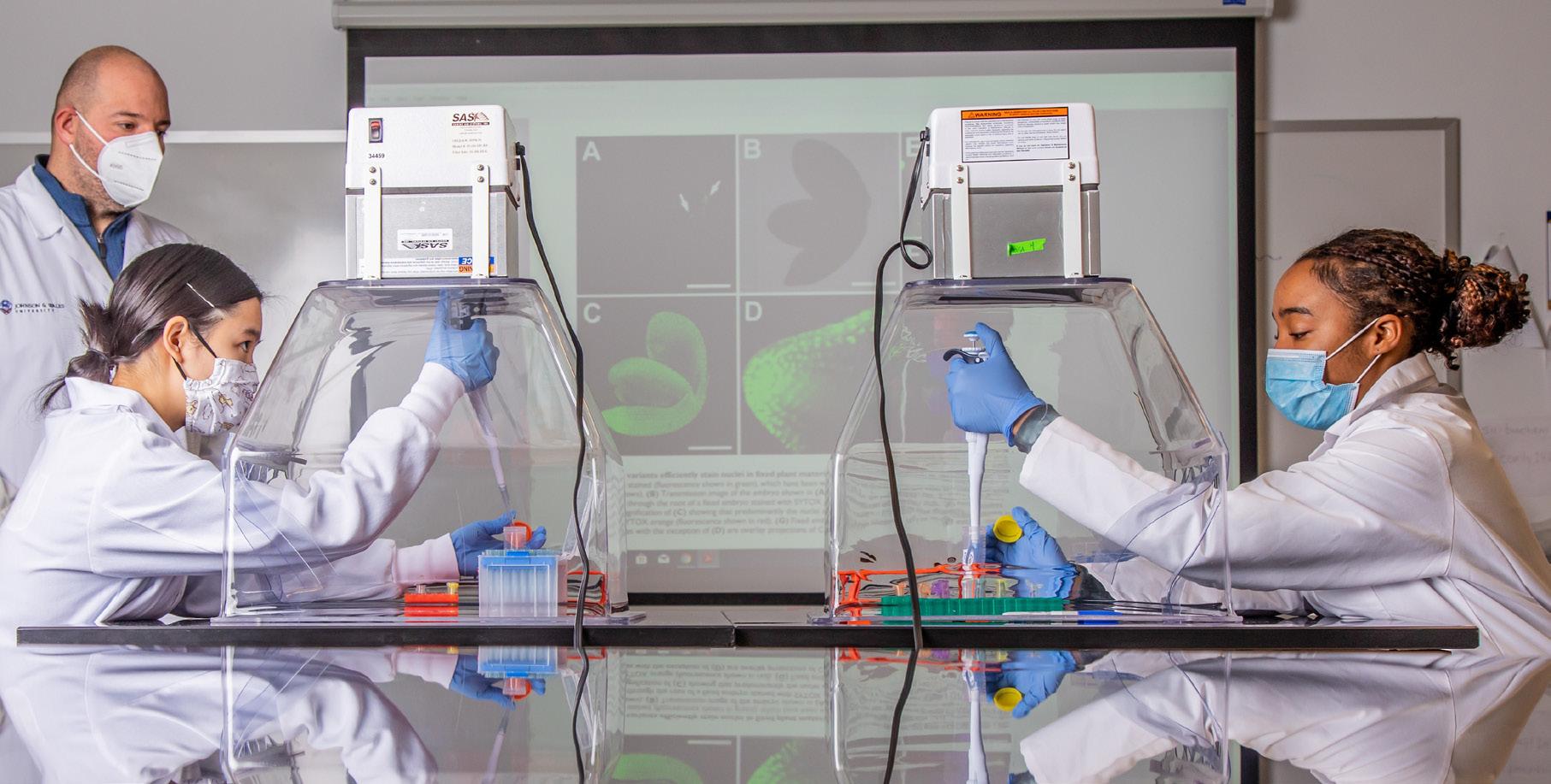 Biology students worked closely with their professor to conduct an undergraduate research project in the Molecular Biology Lab.