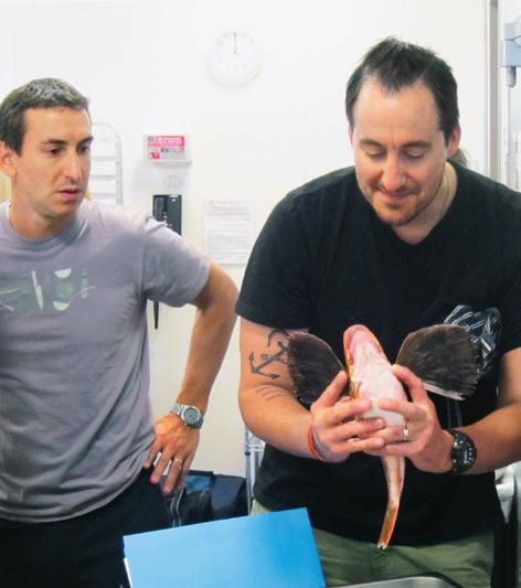 Among the group: Derek Wagner ’99 (Nick’s on Broadway), Matt Varga ’05 (Gracie’s), Ben Mayhew ’10 (Garde de la Mer) and Aaron Thorpe ’01 (Cook & Dagger). Guided by JWU faculty chefs Matthew Britt and Rob Lucier, they had an hour to eviscerate, create, taste and assess butterfish, dogfish, American eel, scup, monkfish, and striped sea robin, a few of the species fresh from the ocean.