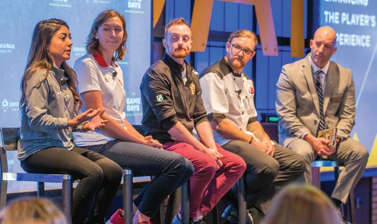 “Enhancing the Player’s Experience,” was facilitated by Culinary Nutrition Associate Professor Jonathan Poyourow, ’03, RD, LD, CSCS. Panelists included Keith Garman ’09, team chef for the Boston Bruins; James Glaude ’15, executive chef with the Boston Red Sox; Becky Lindberg Schroeder ’13, a sports nutrition coordinator at the University of Louisville; and Priscilla Martinez ’15, executive performance chef for the LA Clippers.
