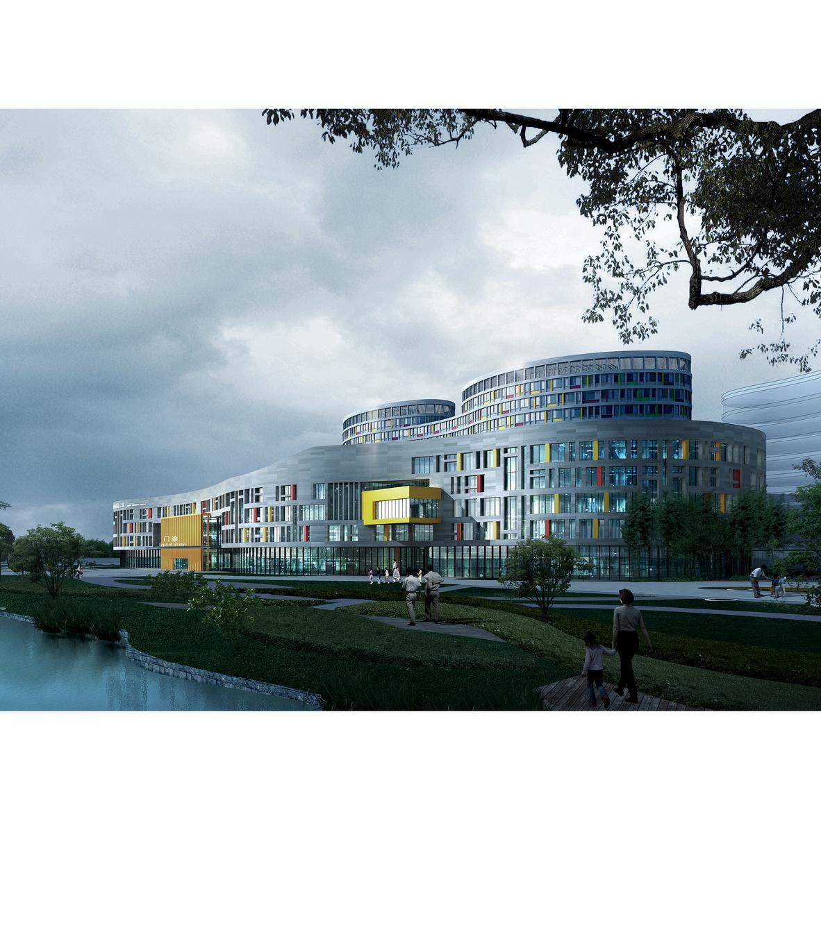 The last of five hospitals for New Century Hospital, this dual-focus private facility in Foshan, China, addresses the need for an integrated 30-day birthing process and post-birth care. It features separate sections for birthing and pediatric care, with a tower design reflecting this duality. The hospital includes 250 birthing beds, 110 children's beds, a NICU, an operating suite, clinics, radiology, and spacious lounge areas Additionally, the birthing tower offers a club level with a restaurant, training kitchen, fitness center, learning center, and counseling suite.