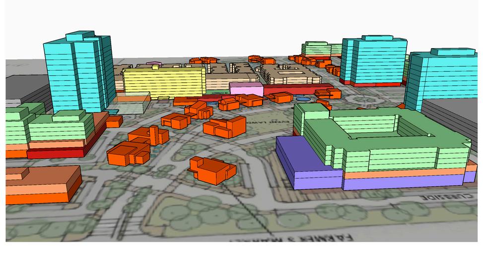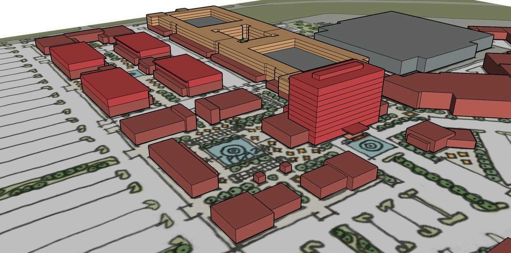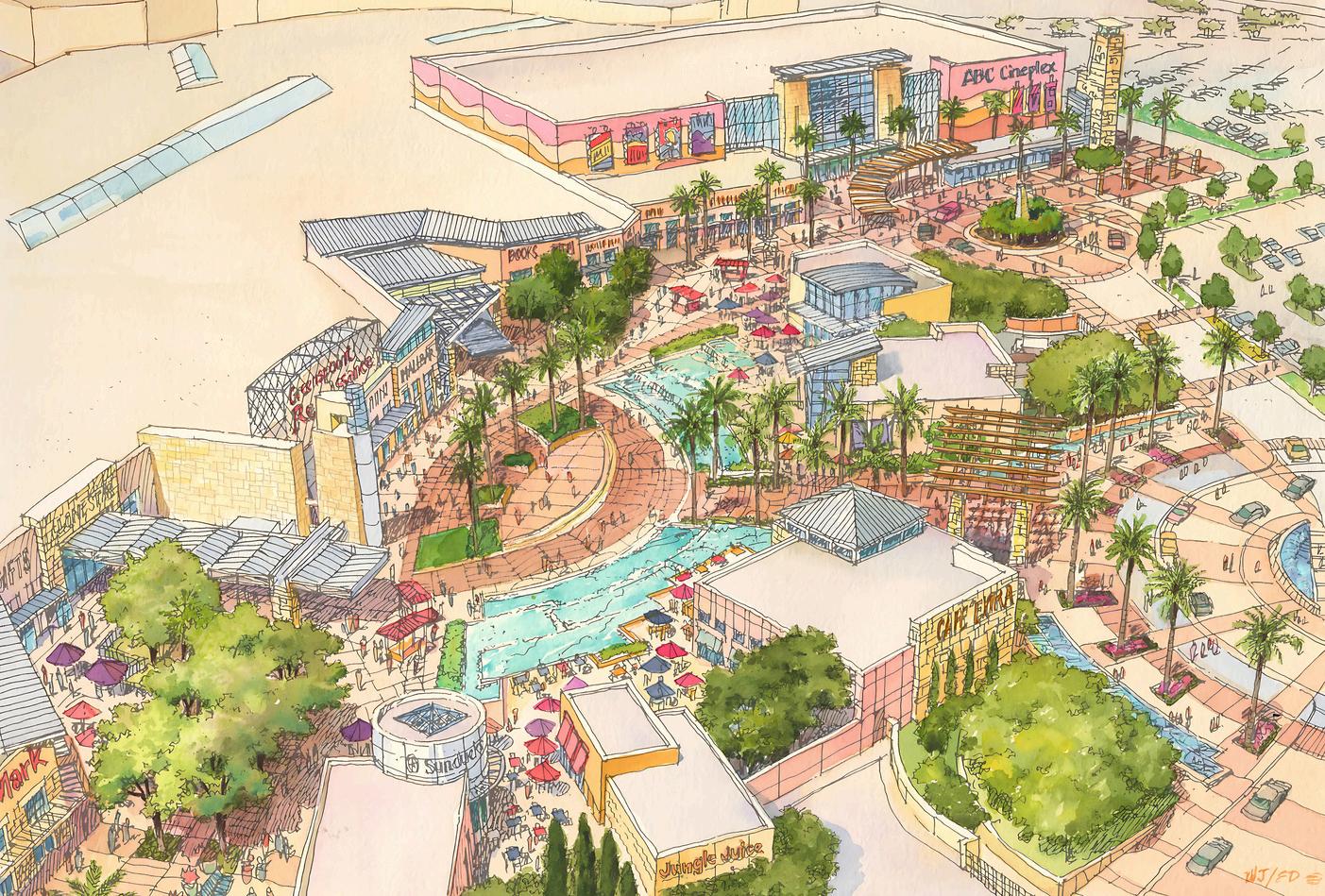 outdoor-oriented mixed-use development Because several parcels are not controlled by the mall owner, the design works around these areas while maximizing the highly trafficked location The plan focuses on bigbox retail where appropriate, a central Town Center, and multifamily wrap apartments that anchor the village and connect to additional retail wings. In many concepts, the existing 12-story Jewelry Center becomes the centerpiece of the redevelopment.