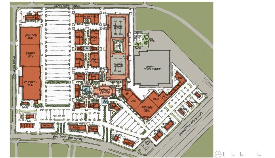 A large conceptual master plan for a long-vacant site at Westheimer Road and Beltway 8 in Houston, Texas The goal was to transform the existing buildings into an integrated, walkable mixed-use community. Multiple schemes explored a ribbon of outdoor spaces connecting restaurants, multifamily over grocer, office, and hotel uses. The phased approach incorporated courtyards and quads, ensuring each phase functioned as a complete environment when built.