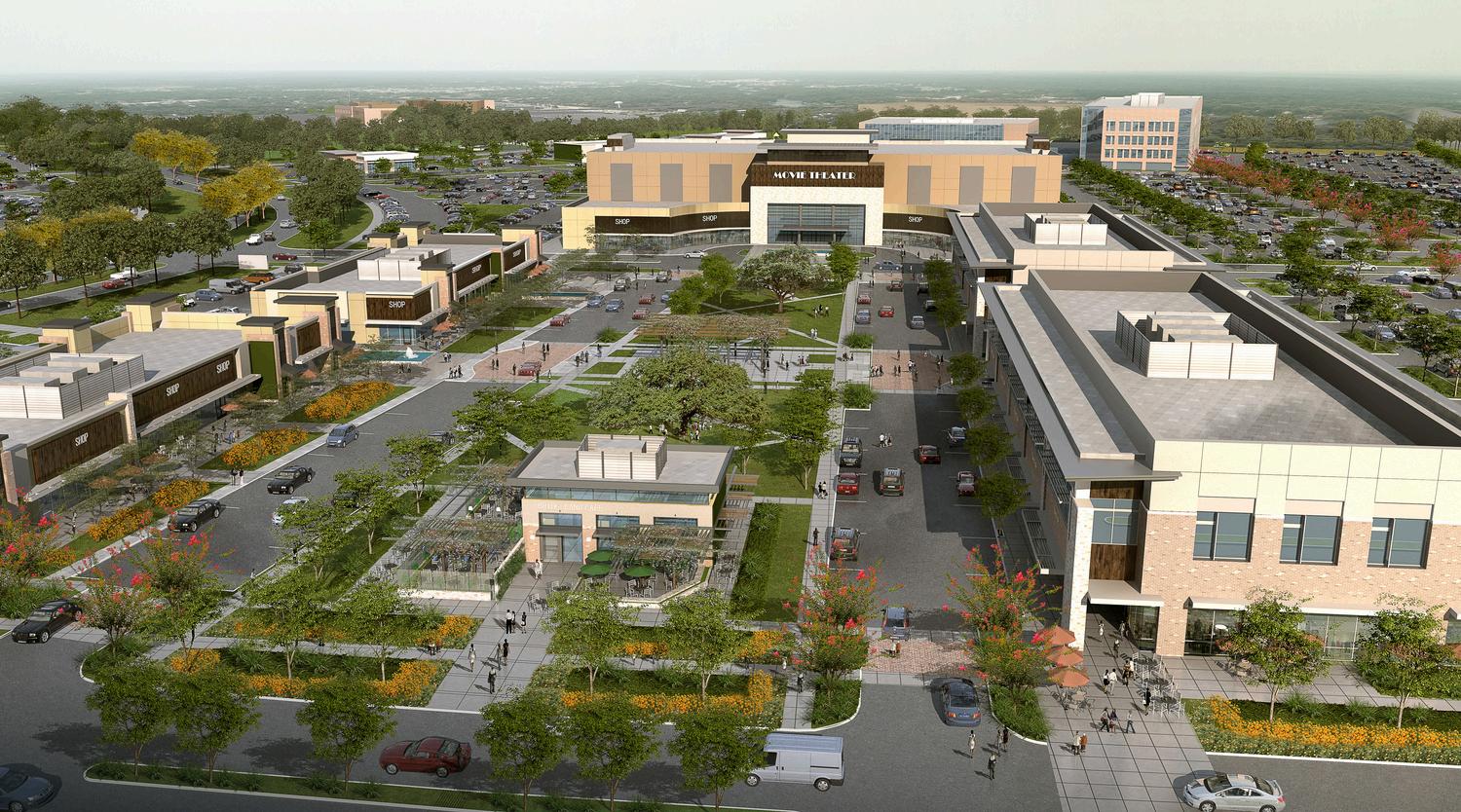 This Sugar Land development envisioned a more urban town center with a central green and layers of hotel, office and retail development The central park is bracketed by two parking garages with retail and multifamily wrapping them This creates a walkable plan with three distinct urban forms: town center green, main street shopping district and individual multifamily and hotel bookends.