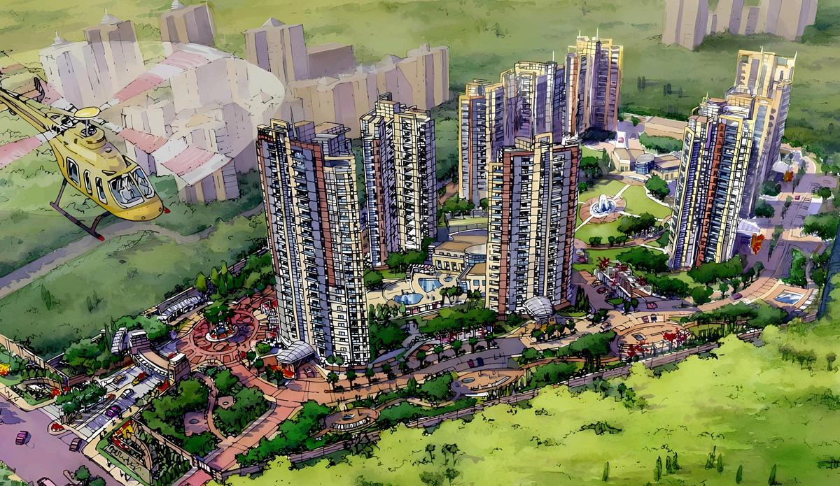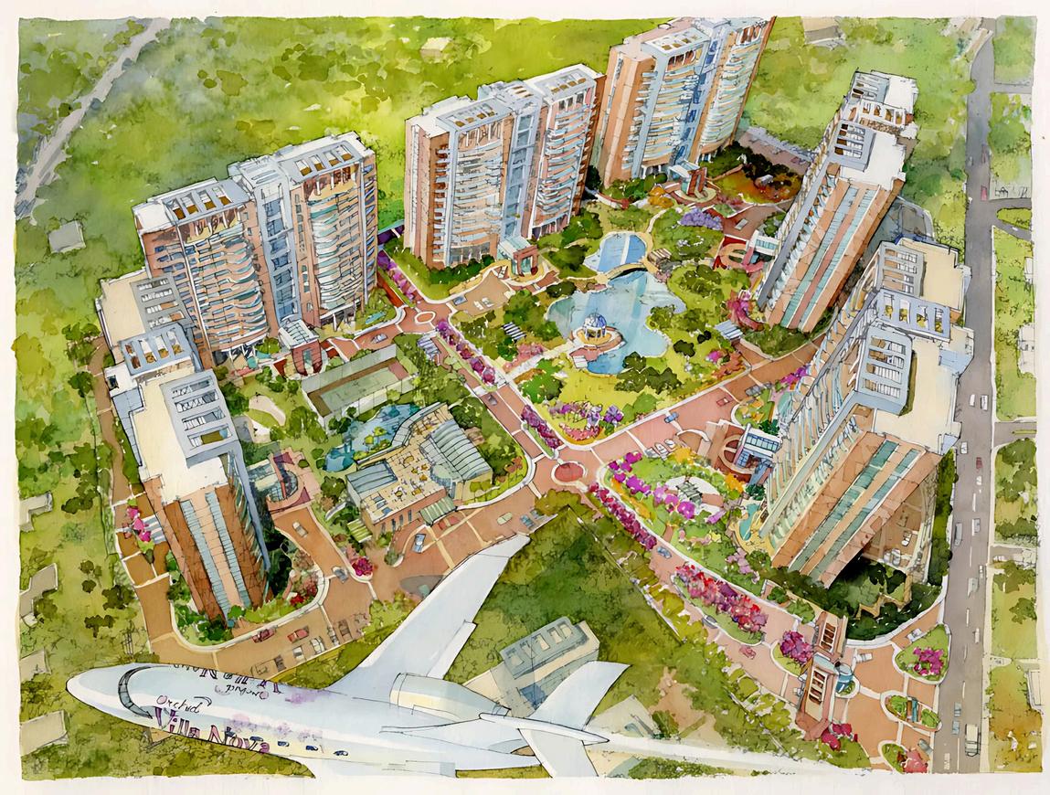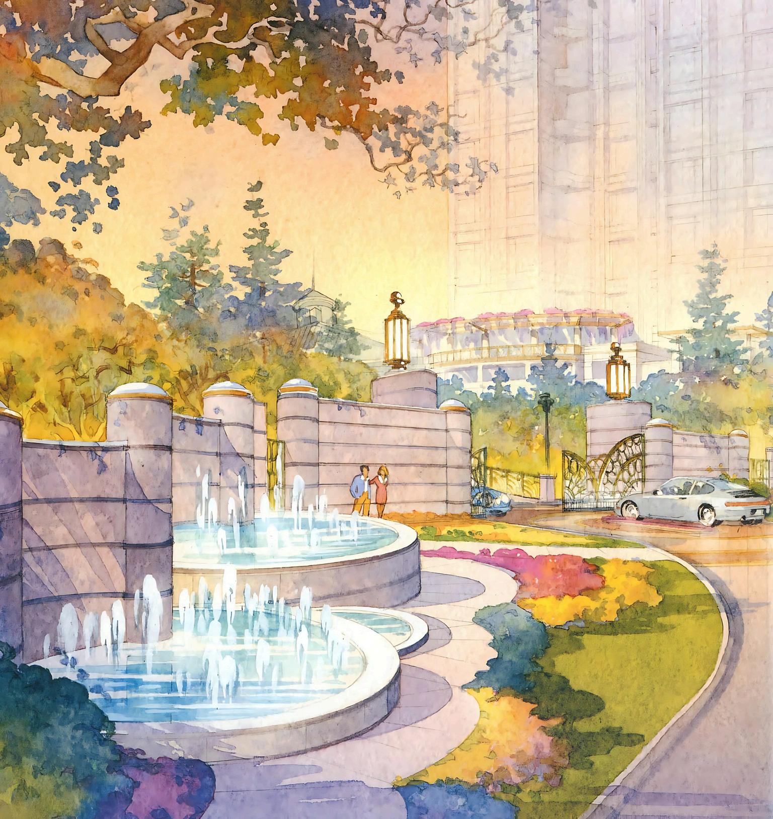 Compact floor plates allow for expansive gardens, while amenities include a clubhouse, restaurant, football pitches, and a Hawaiian-style pool deck