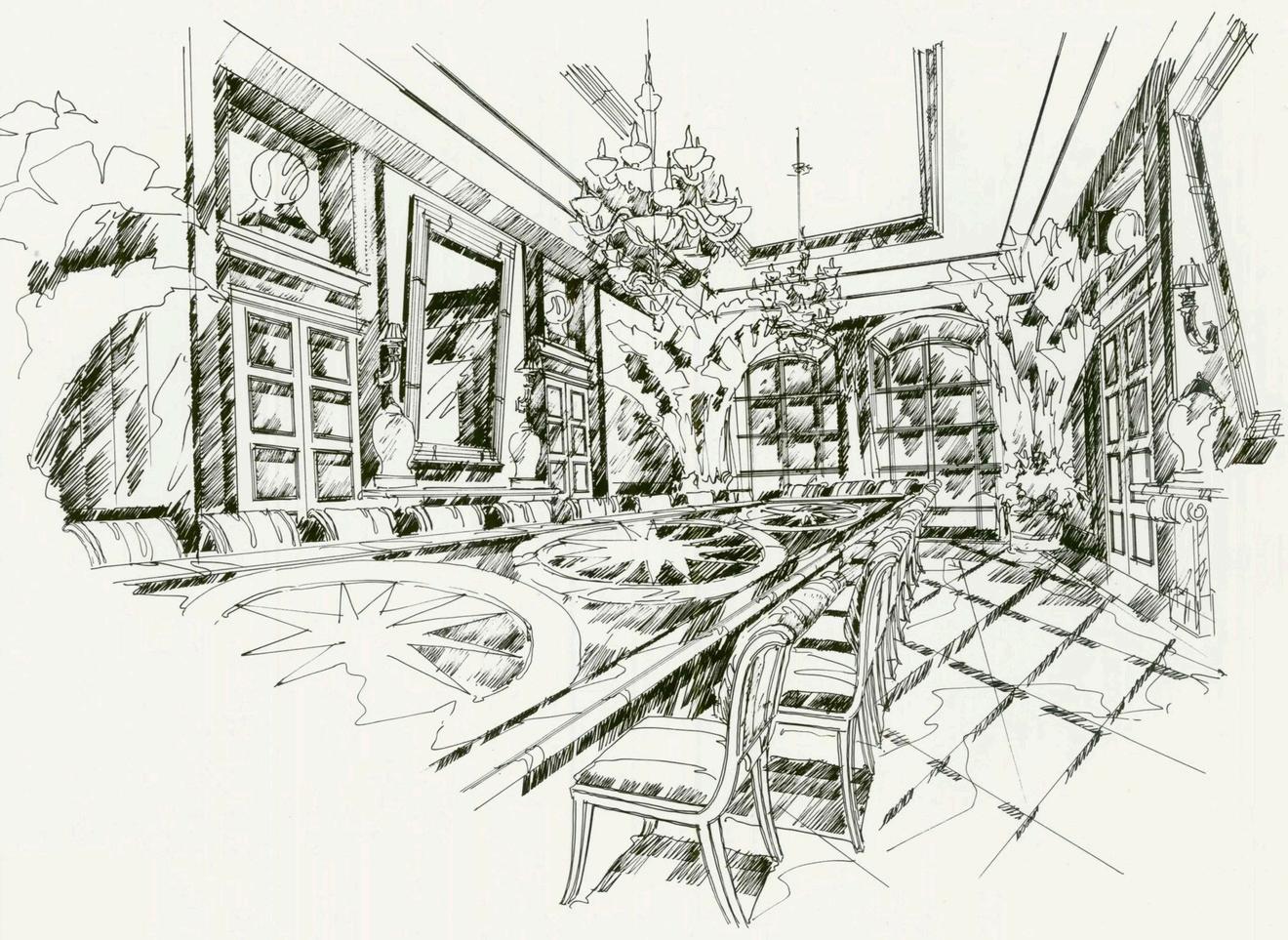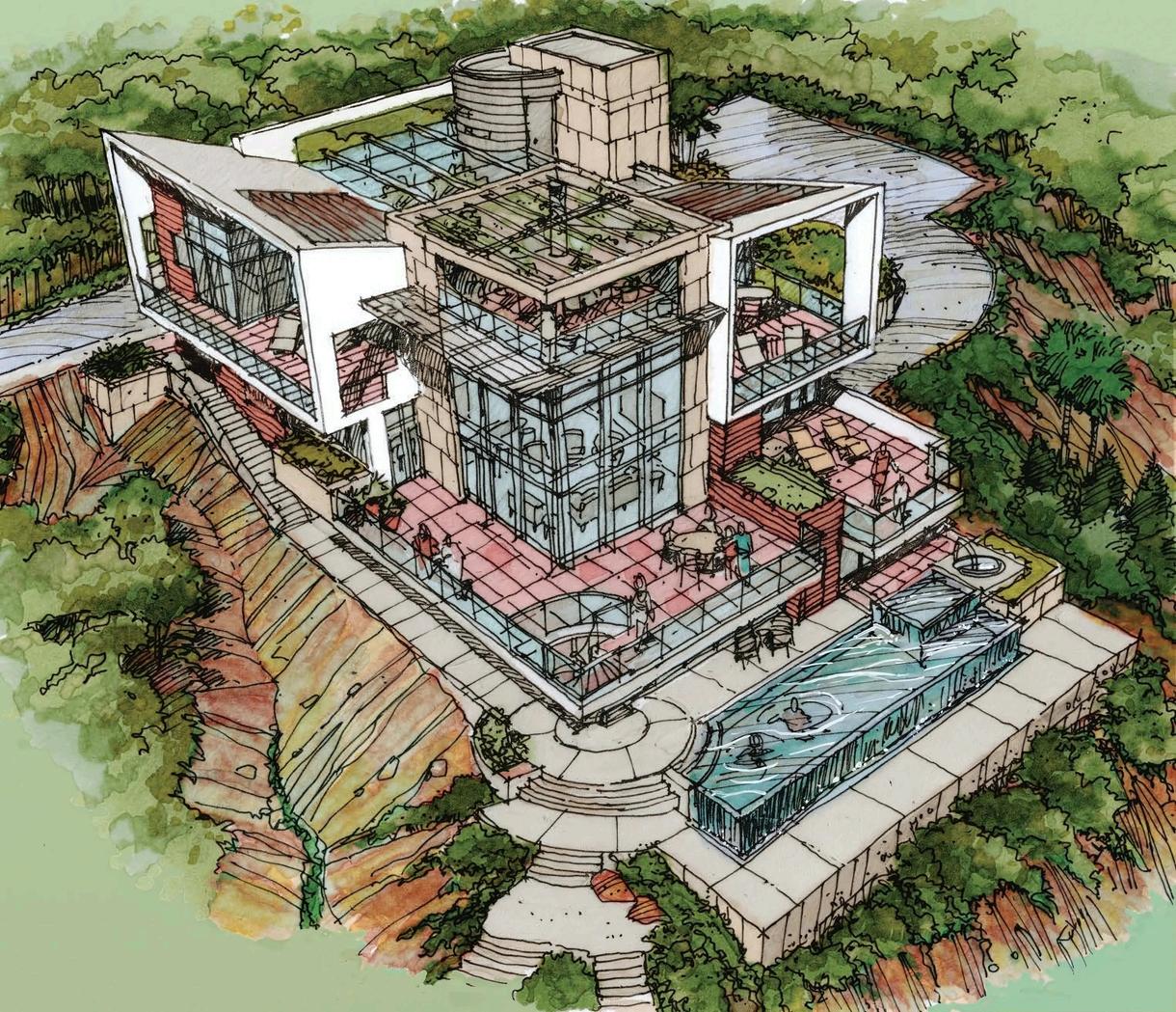 Design for a 25,000 sf residence for a wealthy Russian oligarch The residence is designed as a glass curtainwall dropping from a large copper-clad roof structure The resulting atrium creates a series of multi-story overlooks into the central garden and pool area Designed in 2013