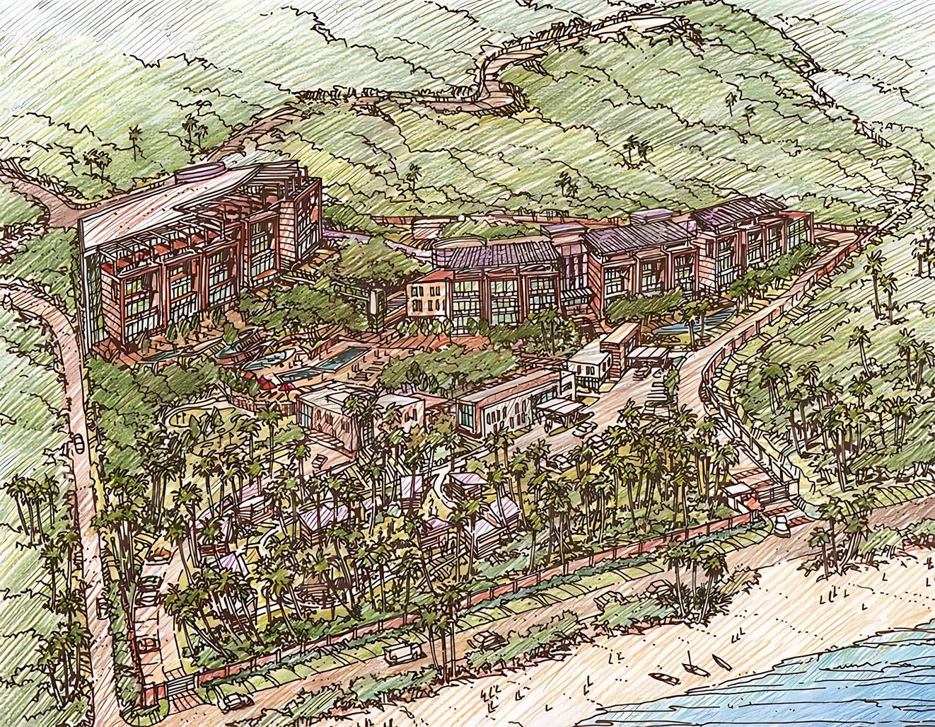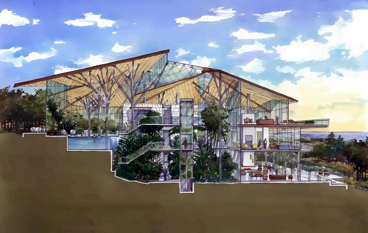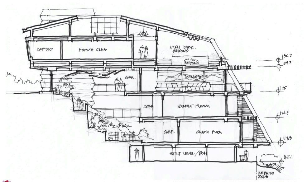 This project is located in the Reis Magos neighborhood of Goa, India once a Portuguese colony adjacent to the historic Fort Aguada and Aguada Beach, an area known for its luxury resorts and hotels The site's steep terrain enhances views from the hotel, inspiring a vertically stepped architectural design, as shown in the concept images. Amenities include a destination restaurant on the lower levels, a fitness center, pool, and a spa with both indoor and outdoor spaces. All facilities offer direct access to Aguada Beach.