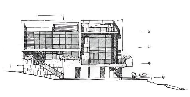 These images present the design for a vacation villa in the mountains of central Lebanon, created for a large Lebanese family. The home spans approximately 430 square meters (4,300 sq. ft.) across four terraced levels that step down the mountainside. Angled for optimal views, the upper-level deck offers sweeping vistas of the Lebanese coastline. Contemporary in style, the design blends the client’s cosmopolitan tastes with natural materials wood and stone that echo the surrounding forest.