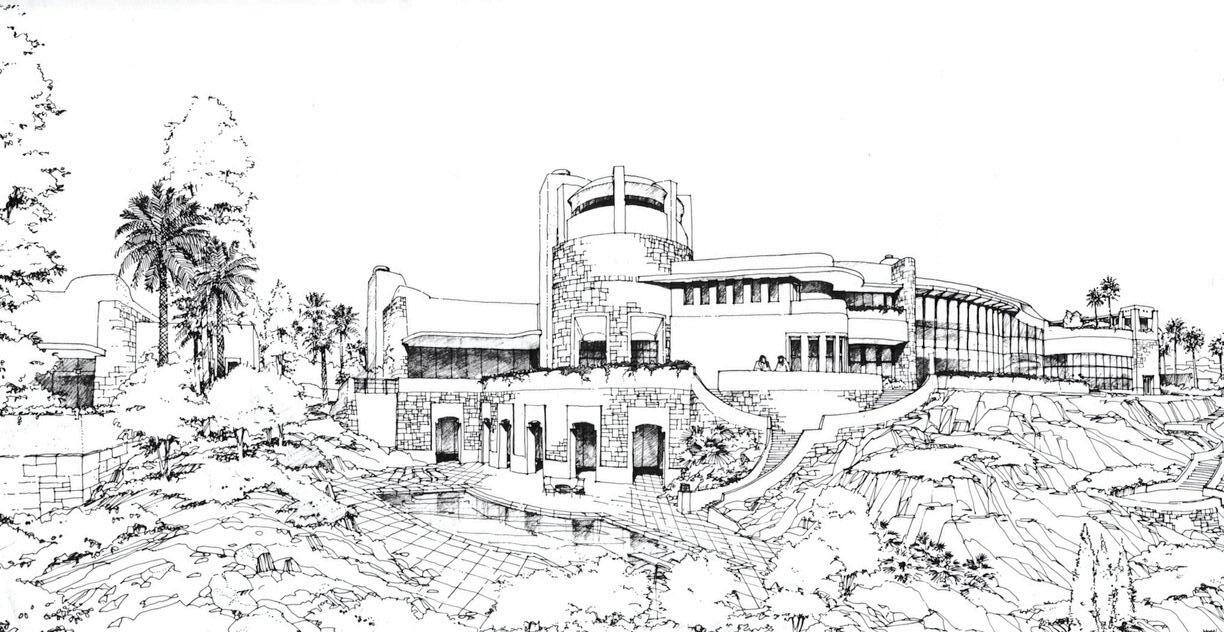 Design of a 120,000 SF private residence and garden estate for a member of the Saudi royal family Located in the Diplomatic Quarter of Riyadh, the property overlooks the Wadi Hanifa and reflects the regional Nejd architectural style The complex comprises a formal main residence, private family quarters, and a men’s majlis for official functions The landscape design evokes a traditional date palm farm, featuring 102 distinct varieties of date palms The project was designed between 1994 and 1996
