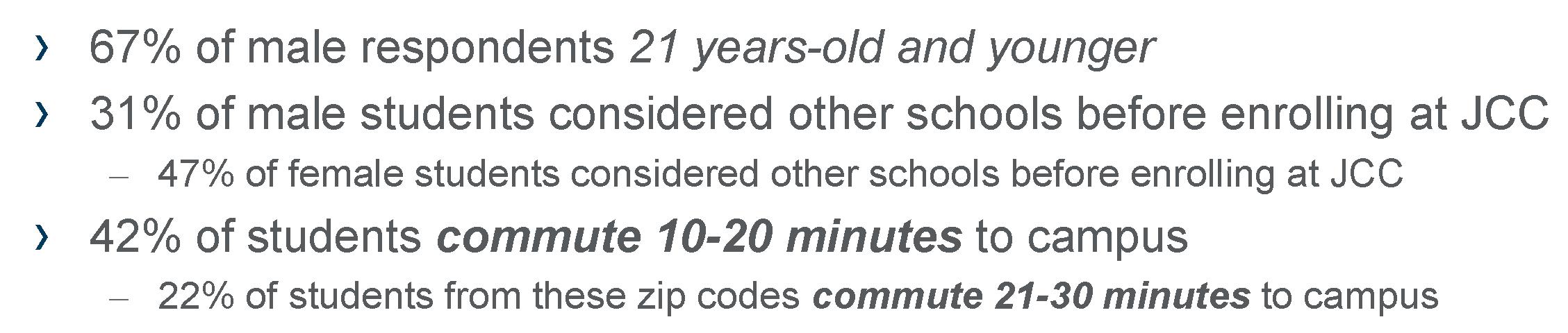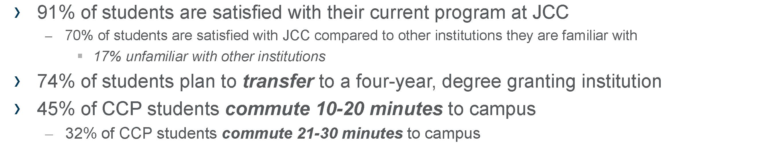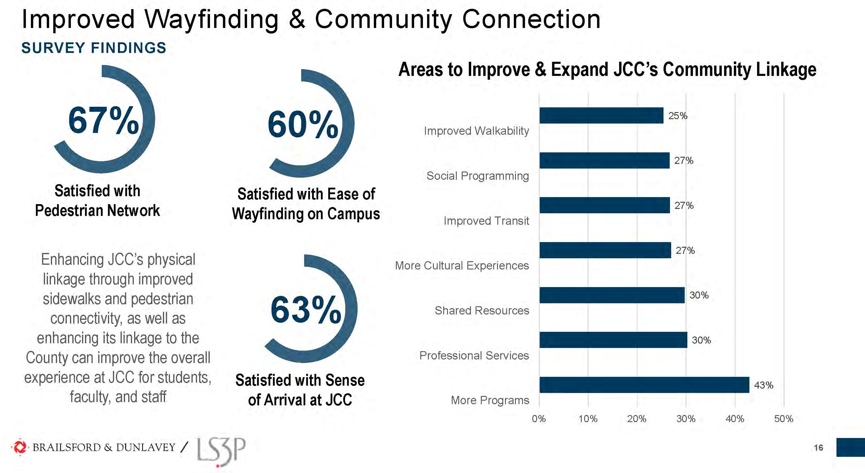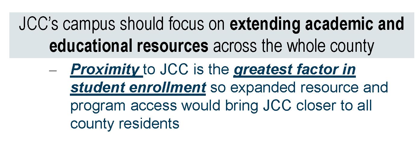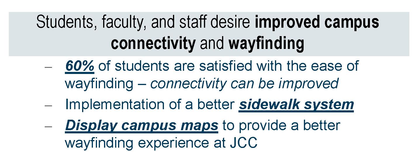 Phase 1 of the Master Plan process involved intense information gathering from students, faculty, and leadership at JCC. This process allowed the design team to then conduct analysis of both the JCC campuses and the county.