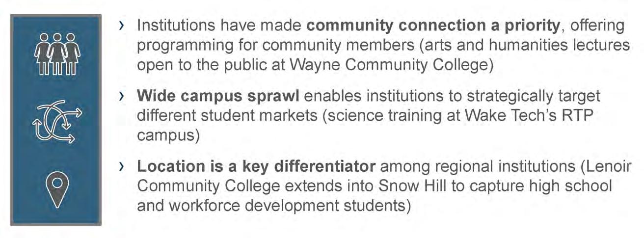 As Johnston Community College continues to grow, and the Johnston County population grows as well, it is important to have a deliberate process in deciding future expansion. The design solutions achieved by an iterative process, and informed by an opportunities/ challenges assessment and local and regional context, will benefit the College now and in the future.