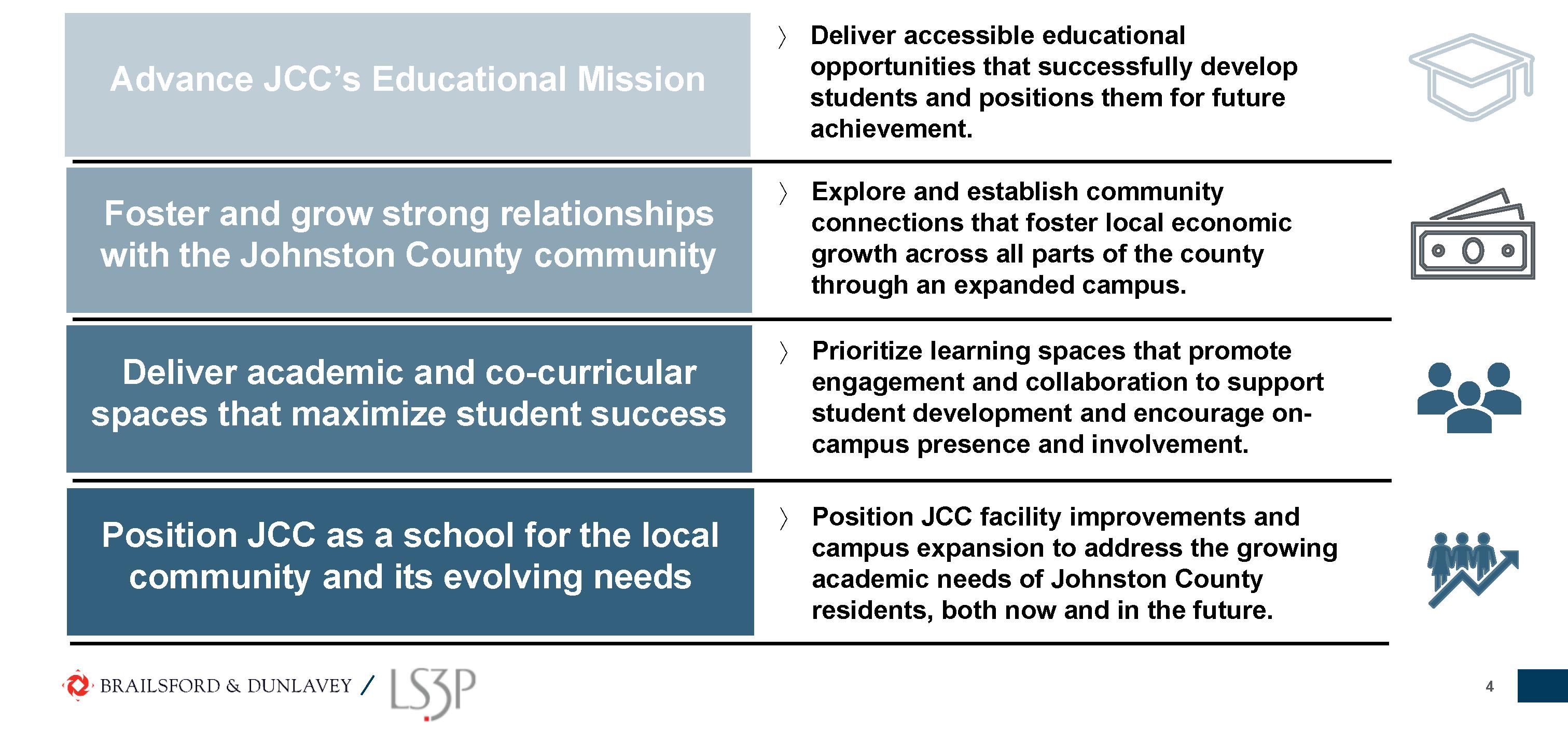 This campus plan aims to cultivate a dynamic learning environment that empowers individuals to excel in a rapidly growing county. This long term plan will result in a campus that is a source of pride and identity for JCC and Johnston County.