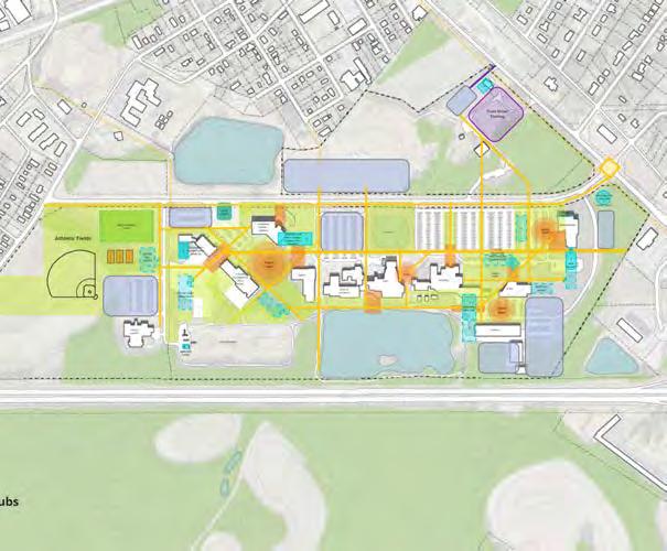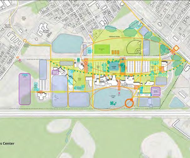 Two big ideas help to organize the plan: campus connectivity through campus hubs, and enhancing the student experience with defined activity zones. These frameworks, along with other supporting ideas, help to establish key organizing ideas for development within JCC’s campus, while maintaining a balance between critical campus systems.