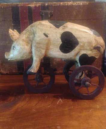 On a table across from the lemonade, I saw something I just had to have. Behind an assortment of antique pottery, cast iron tools and blue Ball jars was a wooden pig, painted white with black hearts, standing on three wheels like a tricycle.