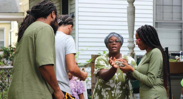 Greg and Laquaya host workshops through Nappésoul to help interested neighbors and community members create their own gardens. Greg pointed to the numerous plants growing in the front yard raspberries, carrots, marigold, cucumbers, mint, thyme, oregano, tomatoes, and more. It’s a “green maze.”