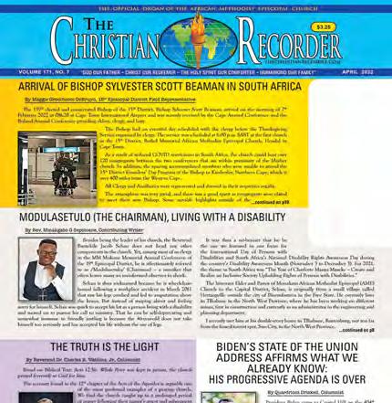 THE CHRISTIAN RECORDER: The Christian Recorder (ISSN 1050-6039, USPS 16880) is the of icial organ of the African Methodist Episcopal Church and a member of the Associated Church Press and the National Newspaper Publishers Association. Founded in 1852, it is printed monthly by the AMEC Sunday School Union, 900 13th Avenue South, Nashville, TN 37212. Periodicals Postage Paid at Nashville, TN.