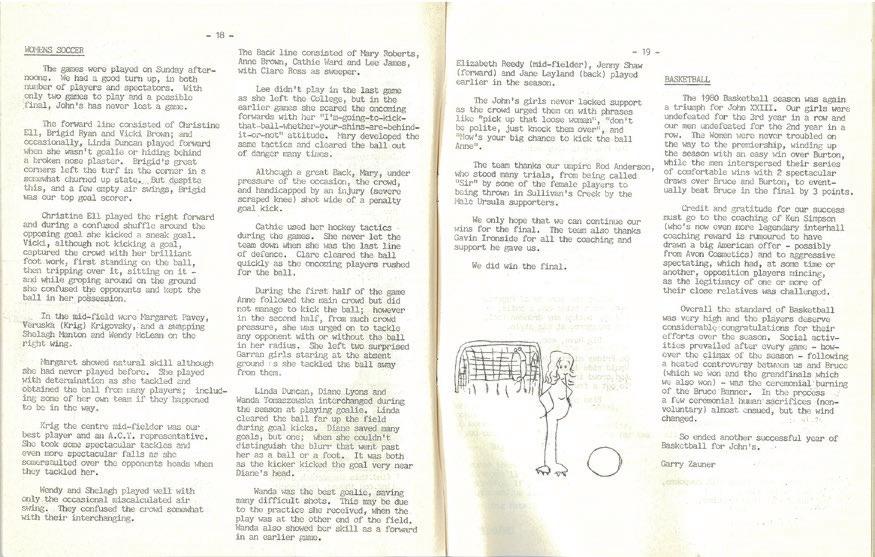 Despite us students’ best efforts, we would be nowhere without the college staff. Their genuine support is the backbone of the community and it allows many of the opportunities and experiences at Johns to thrive. Amongst all the staff I give a special thanks to Jas, Dee, Lachie and Ollie along with all the ‘office mums’ (Will Ward included) for their support in making Johns not just a college, but a real home.