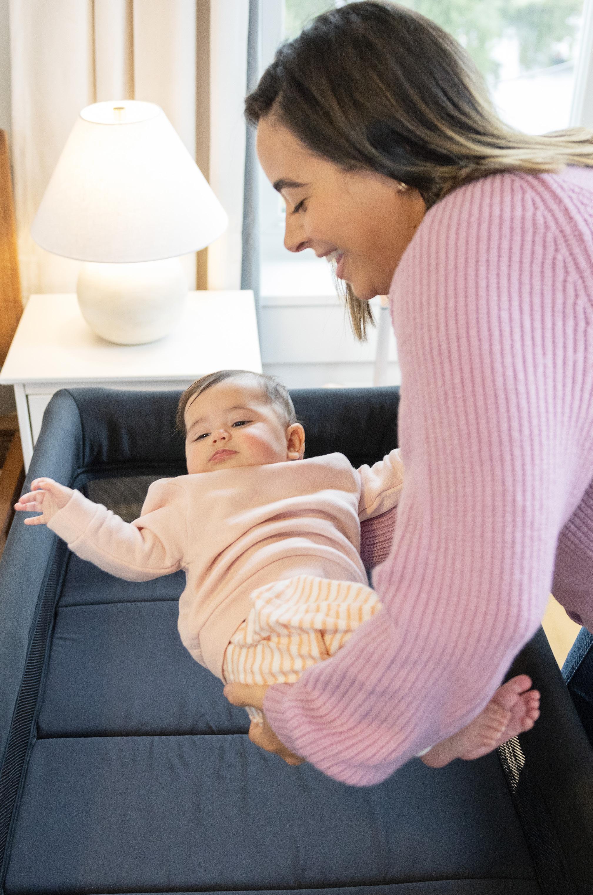 Plush and cushioned lie-flat cot creates a cosy haven that is approved for overnight sleep