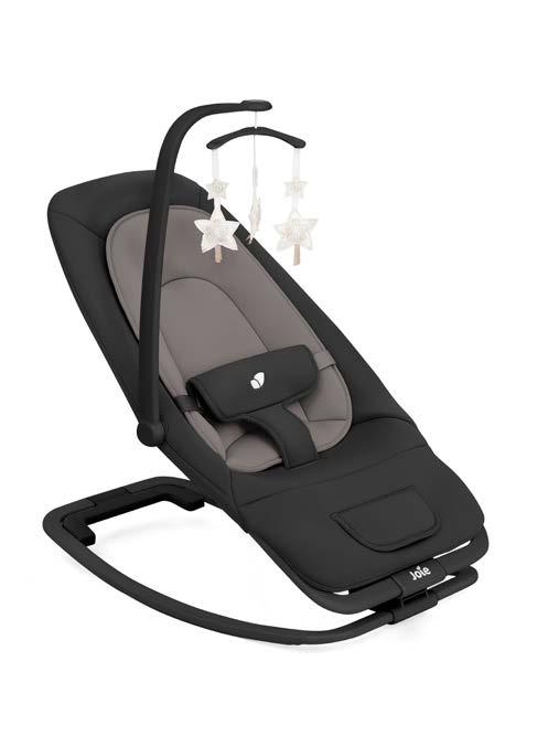Snoozing seat comes with fabric covered toy bar and two plush toys so keeping baby entertained is child’s play