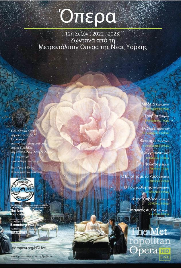 14 ΟΚΤΩΒΡΙΟΥ 2022 | 7 ΜΕΡΕΣ | 25 ΠΟΛΙΤΙΣΜΟΣ Το Θεατρικό Εργαστήρι Πρέβεζας κέρδισε σε Πανελλήνιο θεατρικό διαγωνισμό Το κοινό και την κριτική επιτροπή κέρδισε το θεατρικό “ο Μπεχτσής/ο Νυχτοφύλακας” του Κώστα Λάκη το οποίο παρουσιάστηκε από το Θεατρικό Εργαστήρι Πρέβεζας στο Βιομηχανικό Μουσείο Φωταερίου στο Γκάζι στο πλαίσιο δια γωνισμού συγγραφής και παράστασης θεατρικού έργου του «Culture Is Athens» που διοργάνωσε ο Δήμος Αθηναίων με αφορμή την επέτειο των 100 χρόνων από τη Μικρασιατική Καταστροφή. Η παράσταση απέσπασε το πρώτο βραβείο ανάμε σα από 9 παραστάσεις που επίσης ξεχώρισαν και άφησε τις καλύτερες εντυπώσεις. Η σκηνοθεσία ανήκει στη Λίλη Σακκά η επιμέλεια κειμένου στον Βασίλη Μπούτση , ενώ τους ρόλους του έργου ενσάρκωσαν οι Κοσμάς Μαρκής και Σπύ ρος Παπαδιώτης. Η παράσταση “ο Μπεχτσής/ο Νυχτοφύλακας” απο τυπώνει την ιστορία δύο προσφύγων από τη Σμύρνη το 1922 και τη συνάντηση ζωής που θα έχουν με ένα νυχτοφύλακα στο αφιλόξενο για κείνους περιβάλλον της εποχής. Ο συγγραφέας Κώστας Λάκης εκφράζει τις πιο θερμές ευχαριστίες προς το Θεατρικό Εργαστήρι Πρέβεζας και το κοινό που βρέθηκε στη μαγική (όπως την χαρακτηρίζει) βραδιά στο Γκάζι. Η “Μήδεια” του Λουίτζι Κερουμπίνι σε απευθείας μετάδοση από τη Μετροπόλιταν Όπερα της Νέας Υόρκης, στο Πολιτιστικό Κέντρο Πρέβεζας, το Σάββατο 22 Οκτωβρίου Mε την όπερα του Λουί τζι Κερουμπίνι “Μήδεια” ξεκινούν το Σάββατο 22 Οκτωβρίου και ώρα 8μ.μ οι απευ θείας μεταδόσεις από τη Μετρο πόλιταν Όπερα της Νέας Υόρκης, που διοργανώνει και παρουσιάζει στην πόλη μας για δωδέκατη χρο νιά, το Δημοτικό Ωδείο Πρέβεζας “Σπύρος Δήμας”. Οι μεταδόσεις γίνονται στο Πολι τιστικό κέντρο του Δήμου, Περ δικάρη 2, όπου μετά από μια αναγκαία διακοπή δύο και πλέον ετών λόγω της πανδημίας , θα προσφέρουν και πάλι στο κοινό της Πρέβεζας μια επιλογή από καλύτερες παραγωγές της σεζόν. Οι παραστάσεις, που μεταδίδονται σε πραγματικό χρόνο, συνοδεύο νται από ελληνικούς υπότιτλους και έντυπο ενημερωτικό υλικό. Οι προβολές ξεκίνησαν δοκιμα στικά το Δεκέμβριο του 2009 και βρήκαν αμέσως ανταπόκριση από πολλούς πολίτες της Πρέβεζας αλλά και από άλλες περιοχές της Ηπείρου και της Λευκάδας, καθι στώντας την Πρέβεζα πρωτοπόρα πόλη σε Πανελλαδική κλίμακα, στη συνεργασία της με τη Με τροπόλιταν όπερα. Η Πρέβεζα πλέον είναι η μο ναδική πόλη της Ελλάδας που συνεχίζονται οι μεταδόσεις, χτί ζοντας μια μοναδική παράδοση πολιτιστικής προσφοράς. Η Σόντρα Ραντβανόβσκι πρωτα γωνιστεί, μαζί με ένα εκπληκτι κό καστ στην νέα παραγωγή του Ντέιβιντ ΜακΒίκαρ, σε έναν ρόλο που έγινε διάσημος από τη Μαρία Κάλλας. Η παραγωγή είναι σε συ νεργασία με την Εθνική Λυρική Σκηνή στη οποία θα παρουσιαστεί την ερχόμενη άνοιξη με διαφορε τική διανομή ρόλων. Διευθύνει ο Κάρλο Ρίτζι. Η μεταφραστική επιμέλεια των Ελληνικών υπότιτλων είναι από τη Δώρα Ζαμπέλη. Η φετινή σεζόν περιλαμβάνει επί σης τις ακόλουθες όπερες: ▶ Τραβιάτα (Βέρντι), 5 Νοεμβρίου 2022 ▶ Οι Ώρες (Κέβιν Πατς), 10 Δε κεμβρίου 2022 ▶ Φεντόρα (Τζιορντάνο), 14 Ια νουαρίου 2023 ▶ Λόενγκριν (Βάγκνερ), 18 Μαρ τίου 2023 ▶ Φάλσταφ (Βέρντι), 1 Απριλίου 2023 ▶ Ο Ιππότης με το Ρόδο (Στράους), 15 Απριλίου 2023 ▶ Ο Πρωταθλητής (Μπλά ντσαρντ), 29 Απριλίου 2023 ▶ Ντον Τζιοβάνι (Μότσαρτ), 20 Μαΐου 2023 ▶ Ο Μαγικός Αυλός (Μότσαρτ), 3 Ιουνίου 2023 Τιμή εισιτηρίου 8 ευρώ και 4 ευρώ για μαθητές και φοιτητές. Περισσότερες πληροφορίες στο τηλέφωνο 2682025320.