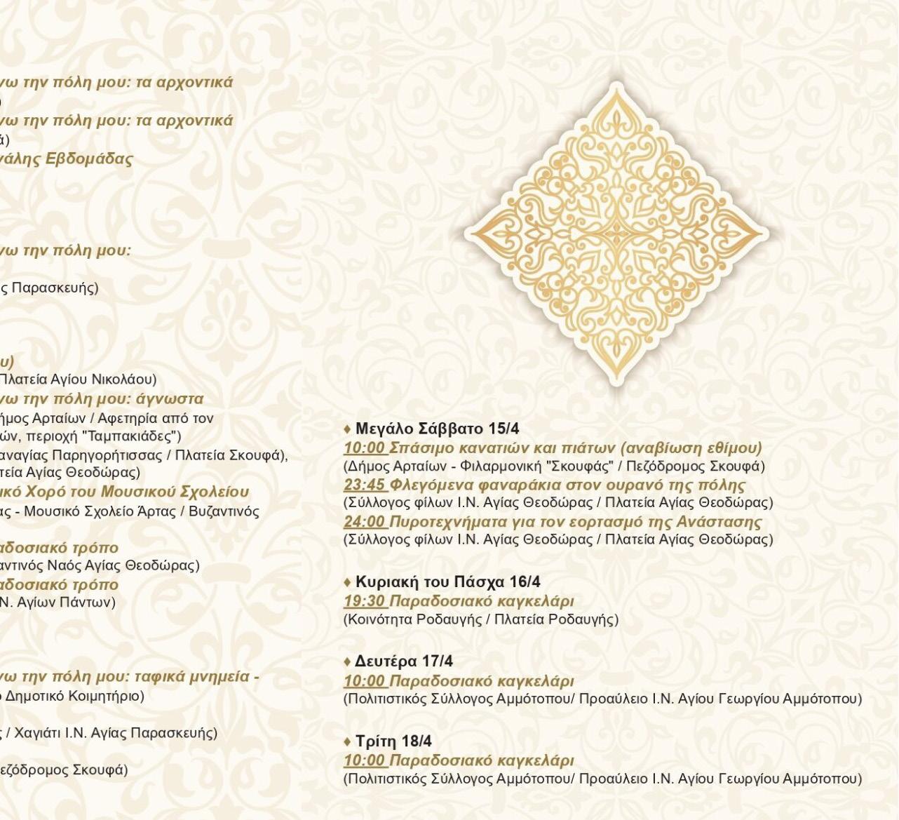 Το πρωί του Μ. Σαββάτου στο ιστορικό κέντρο θα σημάνει το χαρμόσυνο μήνυμα της πρώτης Ανάστασης με το χαρακτηριστικό έθιμο του σπασίματος των πήλινων, ενώ το βράδυ πριν την επίσημη τελετή ο Σεβασμιότατος θα τελέσει την κατανυκτική Ανάσταση στο κοιμητήριο.