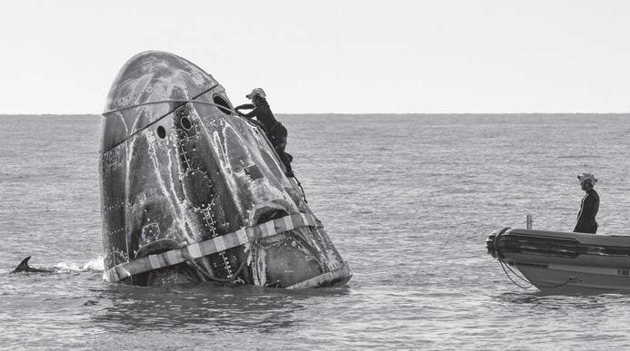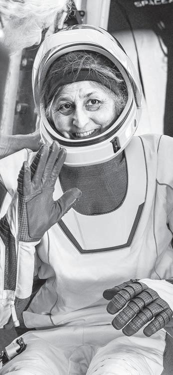 미국 플로리다주 해상에 스페 이스X의 유인우주선 ‘드래곤 캡슐’이 낙 하산을 펼친 채 하강했다. 착수한 캡슐 을 인양하는 모습. 캡슐에서 나와 환하 게 웃고 있는 우주비행사 수니 윌리엄스. [로이터·EPA·AFP=연합뉴스]
