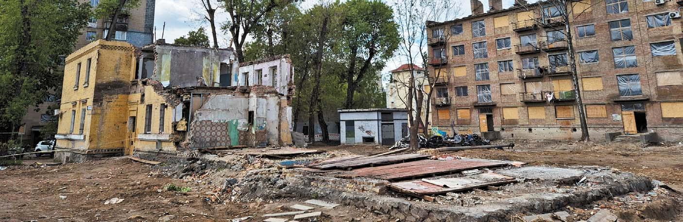 지난17일(현지시간)우크라이나수도키이우에있는한아파트단지의모습.한달여전러시아가발사한북한제KN-23미사일에맞아완전히파괴된뒤흔적만남아있다.