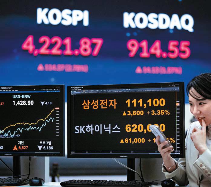 컬처 >> 22면, 스포츠 >> B6·B7면 코스피가 3% 가까이 상승하며 사상 처음으로 4200선 위로 올라섰다. 삼성전자는 11만원, SK하이닉스 는 60만원을 돌파하며 각각 사상 최고가를 기록했다. 젠슨 황 엔비디아 최고경영자가 한국 기업과의 협력 을 강조한 데다, 조선과 방산 대형주들이 3분기 호실적을 발표하며 지수 상승을 이끌었다. >> 관계기사 4면