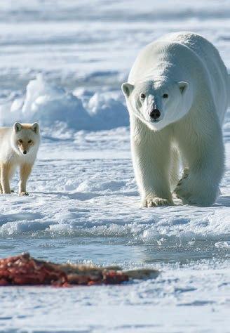 북극곰의 사냥 현장을 따라다니며 고 기 조각을 얻는 북극여우는 북극곰 의 사냥 성공률과 지방 섭취량에 따 라 개체 수가 변할 정도로 밀접한 관 계를 맺고 있다. 하지만 이런 생태적 순환이 흔들 리고 있다. 기후변화로 해빙이 빠르 게 진행되면서 북극곰 개체