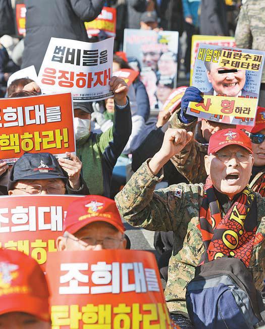 주문 선고 전부터 눈물을 흘리며 자리를 이 탈하기도 했다. 반면 촛불행동 집회 측은 사형 선고 를 촉구했다. 박주민 더불어민주당 의 원은 선고 직전 “국민들이 온몸으로 막 은 내란이다. 헌정 질서를 바로잡으려면 사형을 선고해야 한다”고 했다. 일부 진 보 유튜브 채널 운영자들은 선고 후 간 이 의자 위에 올라가 승리의 V 표시를 하며 춤을 췄다. 양 진영 집회 참가자 모 두 선고 20여 분 만에 자리를 떠서 충돌 은 없었다.