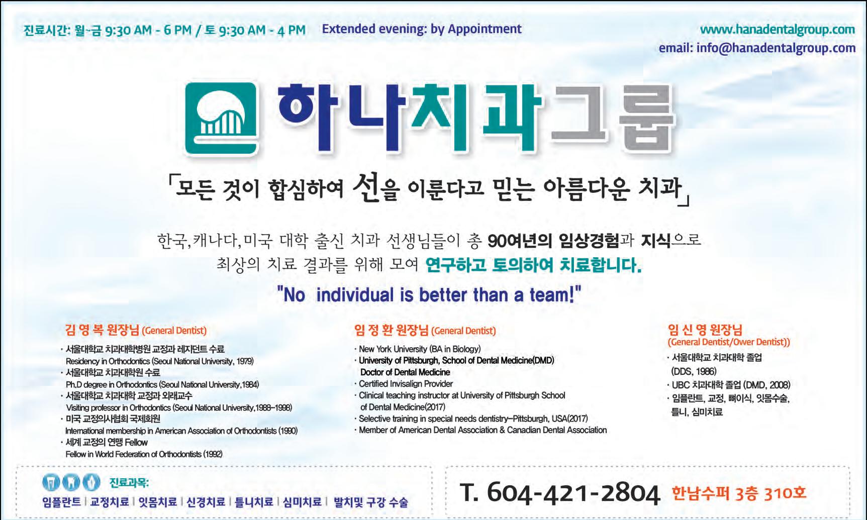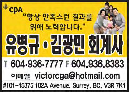 $100/월 16회 신문발행4회 &인터넷 e-중앙일보 (매주 화,수,금,토 발행) 지금 연락하십시오 바로 내일 게재됩니다 중앙타운 & 홈페이지 업소록 광고문의 Tel. 604-544-5155 Email:ad@joongang.ca www.joinsmediacanada.com el: 604-544-5155/5150/5153 Email: ad@joongang.ca Printed on November 25th, 2022 부동산 매매 등기 / 공증서 / / 유언장 / 비지니스 매매 / / 양도위임장 / 계약서 / 진술서 604.416.0211 법률 공증사무소 최병하 법률공증사 헬스타운 비타민 쇼핑몰 OPEN gdvitamin.com 건강식품 3000여종 취급, 저렴한 가격, 한국택배까지 22년 2007-2020 15년 연속 메달리언클럽 마스터멤버 최재동부동산 Top10% of All Realtors메트로밴쿠버 William Hong, MBA T. 778-997-0427 wkhong99@yahoo.com www.williamhong.com “신중한 거래, 신중한 리얼터” 상담 604-319-6330 “올바른 학습방법, 기분좋은 학습결과” www.eliteprep.ca Junior Elite Prep Consulting 604.736.8922 604.939.6284 좋아서! 쉬워서! 스스로! 한상훈(James Han) T. 604.671.7783 하다현 AGATHA HA T. 604-505-7738 주택 융자 모기지 전문 부장 주택/자동차/비지니스/여행자 보험 외 한인종합보험(주) 유 용 규 Yong Yoo 604.803.9746 24 / 7 상담가능 604.992.2580 모기지 전문가 이 경 은 shanna.lee@rbc.com (Shanna Lee) 방정희 변호사 604.559.1470 파이오니아 법무법인 꼼꼼한 법률서비스 로 최선을 다하는 한인 1 세대 대표 로펌 박신일 법률공증사 NOTARY PUBLICSHINIL PARK 부동산 등기/사업체 양도 유언장/위임장/증언서/공증 T604.936.7275 주태근/앤디김 회계법인 회계/세무/감사/사업계획 및 상담 T. 604-936-5222 T.604 936 7777 #101-15375 102A Avenue. Surrey. BC victorcga@hotmail.com 이경수 kyungsooa@gmail.com 주거 & 상업용 매매 / 임대 / 관리 전문 “17년 경력의 전문 리얼터” 공인중개사 778-322-7942 식당/식품 가디언 한인약국 Guardian HANIN PHARMACY #201-329 North Rd, Coquitlam 604.939.7880 코퀴틀람 한인빌리지내, 한아름마트 옆 #210-1175 Johnson St, Coquitlam BC V3B 7K1 T.778 285 2804 원장 임정환 / 원장 임신영 임플란트 · 교정 · 잇몸치료 신경치료 사랑니 크라운 코퀴틀람 센터 그린 치과 오약국 · 가정의 밴쿠버 오약국 T.604-800-2250, 604-939-8311 #100-504 Cottonwood Ave. Coquitlam 이글리지 밴쿠버 한인약국 #201B-1194 Lansdowne Dr. Coquitlam 하나치과그룹 김영복 원장/임신영 원장/김경수 원장/임정환 원장 버나비 한남슈퍼 3층 310호 604-421-2804 604.428.0551 김정화 치과 진료 시간 Mon-Fri 10:00am-7:00pm Sat 10:00am-4:00pm (목,일,공휴일 휴진) 103-4501 North Rd. Burnaby BC V3N 4R7 happysmiledental7@gmail.com 웨스트캔 이민컨설팅 공인이민컨설턴트 최 주 찬 WestCan Immigration Consulting T: 604-461-0100 www.westcanimm.com #304-566 Lougheed Hwy. Coquitlam BC 최고 딜러 기술력 진정 여러분이 찾던 정비 shop Pick up & Delivery Service ▶엔진튠업 ▶쇼바 및 서스펜션 ▶마후라 수리 및 교환 ▶컴퓨터 및 각종 전기장치 ▶각종 오일 및 필터 교환 ▶엔진/밋숀 교환 및 수리 ▶브레이크 수리 및 교환 ▶타이어 교환 및 휠 밸런스 ▶에어컨 및 히터 604-430-8040 5757 Beresford St. Burnaby 604.461.4043 604.461.4040 한국어 서비스 English Service 2902 St.Johns Street, Port Moody, BC V3H 2C3 차량 수리기간 중 무료 대차 90% 이상이 고정 고객인 회사 권원식 부동산 T.604-306-6750 bkwonrealtor@gmail.com BRUCE KWON PREC 30년 오랜 경험의 전문 리얼터 레스토랑 전문, 맞춤형 부동산 비지니스 / 투자건물 / LEASE / 경매물건 남승오 부동산 Charles Nam PREC* 604.710.3897 집매매 콘도매매 부동산 투자 신규분양 권장원 DLC 모기지 Andy Kwon Suite 600, 1200 West 73rd Avenue Vancouver. BC V6P 6G5 604.785.8688 DLCmortgage www.andykwonmortgage.com 미국 캐나다 상법 변호사 상법 및 부동산법 / 각종 법인 관련 업무 T. 604.433.0787 ALL POINTS REALTY 위니박 부동산 winniepak@remax.net www.winniepark.net 604.813.8000 브라이언 최 Brian Choi 604.773.9882 뉴 스트림 리얼티 Personal Real Estate Corporation 한인 마켓 담당 팀장 (Korean Team Leader) 김영선 부동산 778.241.5555 밴쿠버 최고의 부동산 전문가 www.youngsunkim.com 건강식품/의료기 교육 학원/학교 금융 보험/은행 법률 회계사/공증/공인번역 버나비 에드먼즈 2호점 T. 604-468-2432 의료 이민/유학 자동차 부동산 가구/건축/인스팩션 Registered Clinical Counsellor, MA, MEd Tel. 778-887-7275 연우심리 상담소 延 友 심리치료 / 놀이치료 / 심리검사 / 부부상담 / 가족상담 604-492-2875 #525-329 North Rd, Coquitlam, BC 프리미엄 캐나다산 허니스틱 광고문의: 604-544-5155