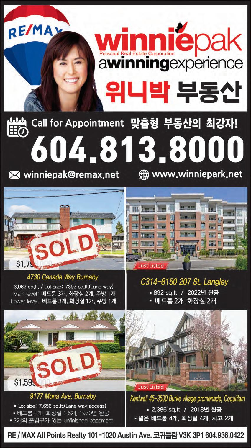 앤디김 회계법인 회계/세무/감사/사업계획 및 상담 T. 604-936-5222 T.604 936 7777 #101-15375 102A Avenue. Surrey. BC vic torc ga@hotmai l.com 식당/식품 가디언 한 인약국 Guardian HANIN PHARMACY #201-329 North Rd, Coquitlam 604.939.7880 코퀴틀람 한인빌리지내 한아름마트 옆 #210-1175 Johnson St, Coquitlam BC V3B 7K1 T. 77 8 285 2804 아씨 마켓 코퀴틀람 점이 있는 Jh 과 Glen 교차몰 원장 임정환 / 원장 임신영 / 원장 김경수 임플 란트 교정 잇몸치료 신경 치료 사랑니 크라운 코퀴틀람 센터 그린 치과 오약국 · 가정의 밴쿠버 한인 오약국 T. 604-800-22 50, 604-939-8 311 #100-5 04 Cottonwoo d Ave. C oquit lam 이글 리지 밴쿠버 한인 약국 T. 604-941-0 454 #201B-11 94 La nsdowne Dr. C oquit lam 하나치 과그룹 김영복 원장/ 임신영 원장/ 김경수 원장/ 임정환 원장 www.han ind enta l.com 진료 시간: 월 - 금 9:30am~6pm, 토 9:30am-4pm 버나비 한남슈퍼 3 층 310 호 604-421-2804 604.428.0551 김정화 치과 진료 시간 Mon-Fri 10:00am-7:00pm Sat 10:00am-4:00pm (목,일,공휴일 휴진) 103-4501 North Rd. Burnaby BC V3N 4R7 happysmiledental7@gmail.com 웨스트캔 이민컨설팅 공인이민컨설턴트 최 주 찬 WestCan Immigration Consulting T: 604-461-0100 www.westcanimm.com #304-566 Lougheed Hwy. Coquitlam BC 최고 딜러 기술력 진정 여러분이 찾던 정비 shop Pick up & Delivery Service ▶엔진튠업 ▶쇼바 및 서스펜션 ▶마후라 수리 및 교환 ▶컴퓨터 및 각종 전기장치 ▶각종 오일 및 필터 교환 ▶엔진/밋숀 교환 및 수리 ▶브레이크 수리 및 교환 ▶타이어 교환 및 휠 밸런스 ▶에어컨 및 히터 604-430-8040 5757 Beresford St. Burnaby 604.461.4043 604.461.4040 한국어 서비스 English Service 2902 St.Johns Street, Port Moody, BC V3H 2C3 차량 수리기간 중 무료 대차 90% 이상이 고정 고객인 회사 권원식 부동산 T.604-306-6750 bkwonrealtor@gmail.com BRUCE KWON PREC 30년 오랜 경험의 전문 리얼터 레스토랑 전문, 맞춤형 부동산 비지니스 / 투자건물 / LEASE / 경매물건 남승오 부동산 C ha rles Nam PREC* 604.710.3897 집매매 콘도매매 부동산 투자 신규분양 미국 캐나다 상법 변호사 상법 및 부동산법 / 각종 법인 관련 업무 T. 604.433.0787 ALL POINTS REALTY 위니박 부동산 winniepak@remax.net www.winniepark.net 60 4. 81 3.8000 김영선 부동산 778.241.5555 밴쿠버 최고의 부동산 전문가 www.youngsunkim.com 건강식품/의료기 교육 학원/학교 금융 보험/은행 법률 회계사/공증/공인번역 버나비 에드먼즈 2호점 T. 604-468-2432 의료 이민/유학 자동차 부동산 가구/건축/인스팩션 Registered Clinical Counsellor, MA, MEd Tel. 778-887-7275 연우심리 상담소 延 友 심리치료 / 놀이치료 / 심리검사 / 부부상담 / 가족상담 604-492-2875 #525-329 North Rd, Coquitlam, BC Tel. 604-992-2580 모 기 지 전 문 가 이경은 광고문의: 604-544-5155 +82-2-549-5993 해외투자이민 전문기업 클럽이민과 상담하세요 모기지 실적 1위 604.319.8080 도승준