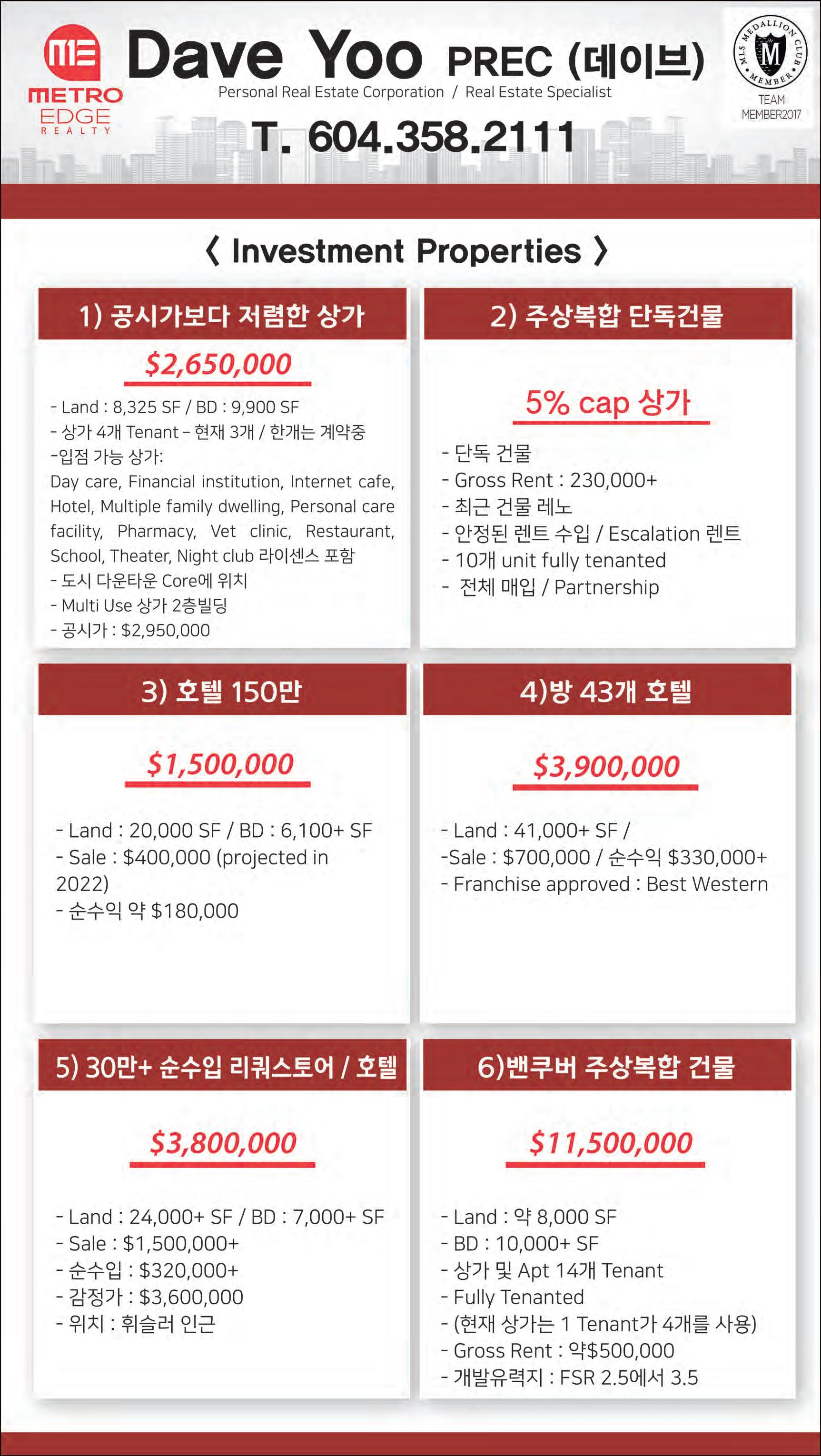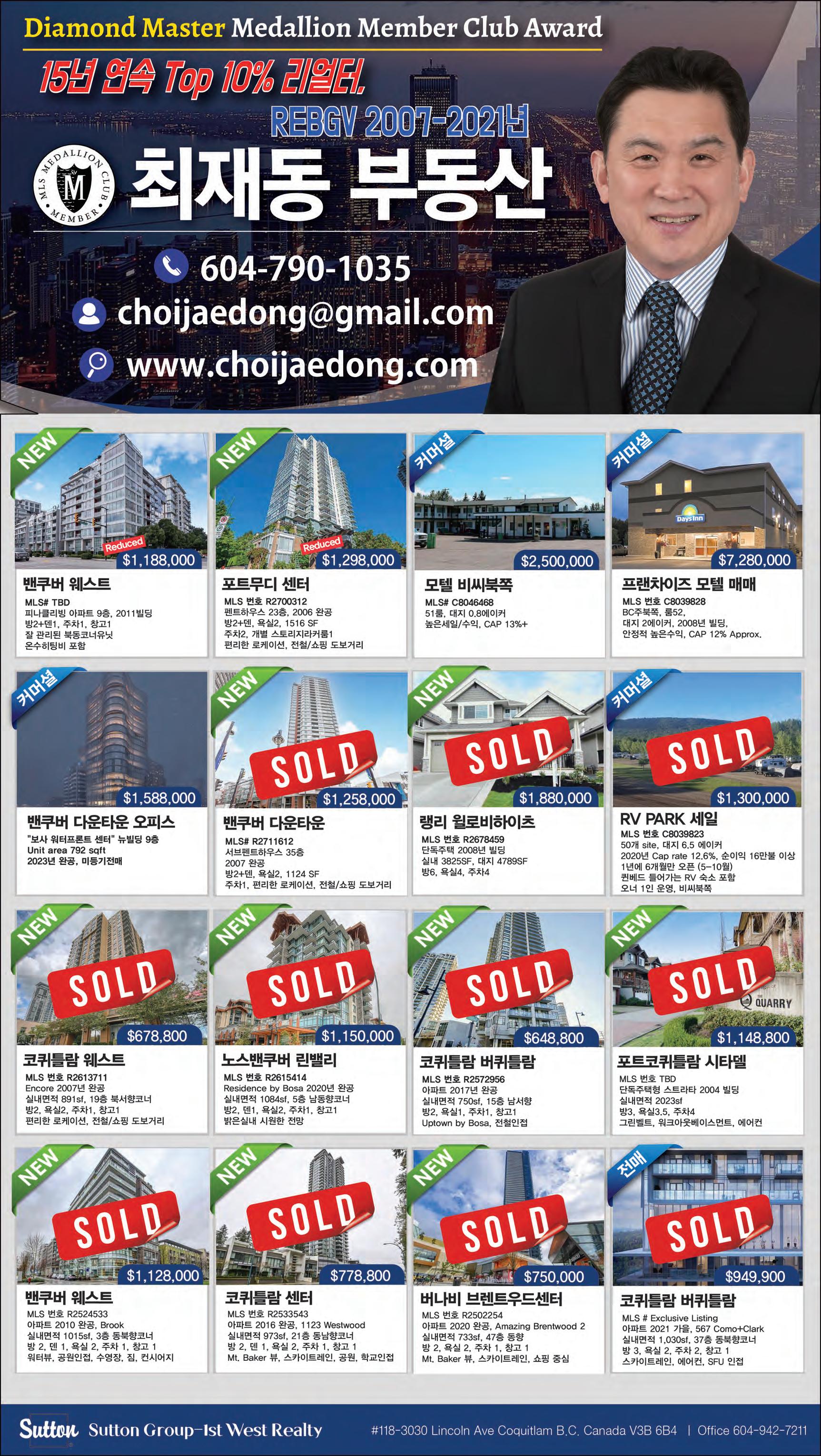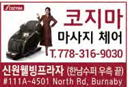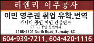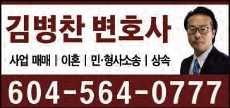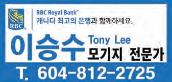 $100/월 16회 신문발행4회 &인터넷 e-중앙일보 (매주 화,수,금,토 발행) 지금 연락하십시오 바로 내일 게재됩니다 중앙타운 & 홈페이지 업소록 광고문의 Tel. 604-544-5155 Email:ad@joongang.ca www.joinsmediacanada.com el: 604-544-5155/5150/5153 Email: ad@joongang.ca Printed on November 30th, 2022 부동산 매매 등기 / 공증서 / / 유언장 / 비지니스 매매 / / 양도위임장 / 계약서 / 진술서 604.416.0211 법률 공증사무소 최병하 법률공증사 헬스타운 비타민 쇼핑몰 OPEN gdvitamin.com 건강식품 3000여종 취급, 저렴한 가격, 한국택배까지 22년 2007-2020 15년 연속 메달리언클럽 마스터멤버 최재동부동산 Top10% of All Realtors메트로밴쿠버 William Hong, MBA T. 778-997-0427 wkhong99@yahoo.com www.williamhong.com “신중한 거래, 신중한 리얼터” 상담 604-319-6330 “올바른 학습방법, 기분좋은 학습결과” www.eliteprep.ca Junior Elite Prep Consulting 604.736.8922 604.939.6284 좋아서! 쉬워서! 스스로! 한상훈(James Han) T. 604.671.7783 하다현 AGATHA HA T. 604-505-7738 주택 융자 모기지 전문 부장 주택/자동차/비지니스/여행자 보험 외 한인종합보험(주) 유 용 규 Yong Yoo 604.803.9746 24 / 7 상담가능 604.992.2580 모기지 전문가 이 경 은 shanna.lee@rbc.com (Shanna Lee) 방정희 변호사 604.559.1470 파이오니아 법무법인 꼼꼼한 법률서비스 로 최선을 다하는 한인 1 세대 대표 로펌 박신일 법률공증사 NOTARY PUBLICSHINIL PARK 부동산 등기/사업체 양도 유언장/위임장/증언서/공증 T604.936.7275 주태근/앤디김 회계법인 회계/세무/감사/사업계획 및 상담 T. 604-936-5222 T.604 936 7777 #101-15375 102A Avenue. Surrey. BC victorcga@hotmail.com 이경수 kyungsooa@gmail.com 주거 & 상업용 매매 / 임대 / 관리 전문 “17년 경력의 전문 리얼터” 공인중개사 778-322-7942 식당/식품 가디언 한인약국 Guardian HANIN PHARMACY #201-329 North Rd, Coquitlam 604.939.7880 코퀴틀람 한인빌리지내, 한아름마트 옆 #210-1175 Johnson St, Coquitlam BC V3B 7K1 T.778 285 2804 원장 임정환 / 원장 임신영 임플란트 · 교정 · 잇몸치료 신경치료 사랑니 크라운 코퀴틀람 센터 그린 치과 오약국 · 가정의 밴쿠버 오약국 T.604-800-2250, 604-939-8311 #100-504 Cottonwood Ave. Coquitlam 이글리지 밴쿠버 한인약국 #201B-1194 Lansdowne Dr. Coquitlam 하나치과그룹 김영복 원장/임신영 원장/김경수 원장/임정환 원장 버나비 한남슈퍼 3층 310호 604-421-2804 604.428.0551 김정화 치과 진료 시간 Mon-Fri 10:00am-7:00pm Sat 10:00am-4:00pm (목,일,공휴일 휴진) 103-4501 North Rd. Burnaby BC V3N 4R7 happysmiledental7@gmail.com 웨스트캔 이민컨설팅 공인이민컨설턴트 최 주 찬 WestCan Immigration Consulting T: 604-461-0100 www.westcanimm.com #304-566 Lougheed Hwy. Coquitlam BC 최고 딜러 기술력 진정 여러분이 찾던 정비 shop Pick up & Delivery Service ▶엔진튠업 ▶쇼바 및 서스펜션 ▶마후라 수리 및 교환 ▶컴퓨터 및 각종 전기장치 ▶각종 오일 및 필터 교환 ▶엔진/밋숀 교환 및 수리 ▶브레이크 수리 및 교환 ▶타이어 교환 및 휠 밸런스 ▶에어컨 및 히터 604-430-8040 5757 Beresford St. Burnaby 604.461.4043 604.461.4040 한국어 서비스 English Service 2902 St.Johns Street, Port Moody, BC V3H 2C3 차량 수리기간 중 무료 대차 90% 이상이 고정 고객인 회사 권원식 부동산 T.604-306-6750 bkwonrealtor@gmail.com BRUCE KWON PREC 30년 오랜 경험의 전문 리얼터 레스토랑 전문, 맞춤형 부동산 비지니스 / 투자건물 / LEASE / 경매물건 남승오 부동산 Charles Nam PREC* 604.710.3897 집매매 콘도매매 부동산 투자 신규분양 권장원 DLC 모기지 Andy Kwon Suite 600, 1200 West 73rd Avenue Vancouver. BC V6P 6G5 604.785.8688 DLCmortgage www.andykwonmortgage.com 미국 캐나다 상법 변호사 상법 및 부동산법 / 각종 법인 관련 업무 T. 604.433.0787 ALL POINTS REALTY 위니박 부동산 winniepak@remax.net www.winniepark.net 604.813.8000 브라이언 최 Brian Choi 604.773.9882 뉴 스트림 리얼티 Personal Real Estate Corporation 한인 마켓 담당 팀장 (Korean Team Leader) 김영선 부동산 778.241.5555 밴쿠버 최고의 부동산 전문가 www.youngsunkim.com 건강식품/의료기 교육 학원/학교 금융 보험/은행 법률 회계사/공증/공인번역 버나비 에드먼즈 2호점 T. 604-468-2432 의료 이민/유학 자동차 부동산 가구/건축/인스팩션 Registered Clinical Counsellor, MA, MEd Tel. 778-887-7275 연우심리 상담소 延 友 심리치료 / 놀이치료 / 심리검사 / 부부상담 / 가족상담 604-492-2875 #525-329 North Rd, Coquitlam, BC 프리미엄 캐나다산 허니스틱 광고문의: 604-544-5155
