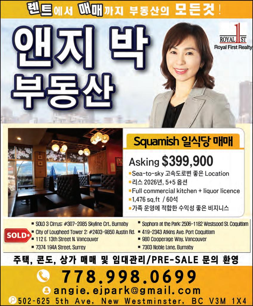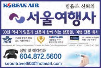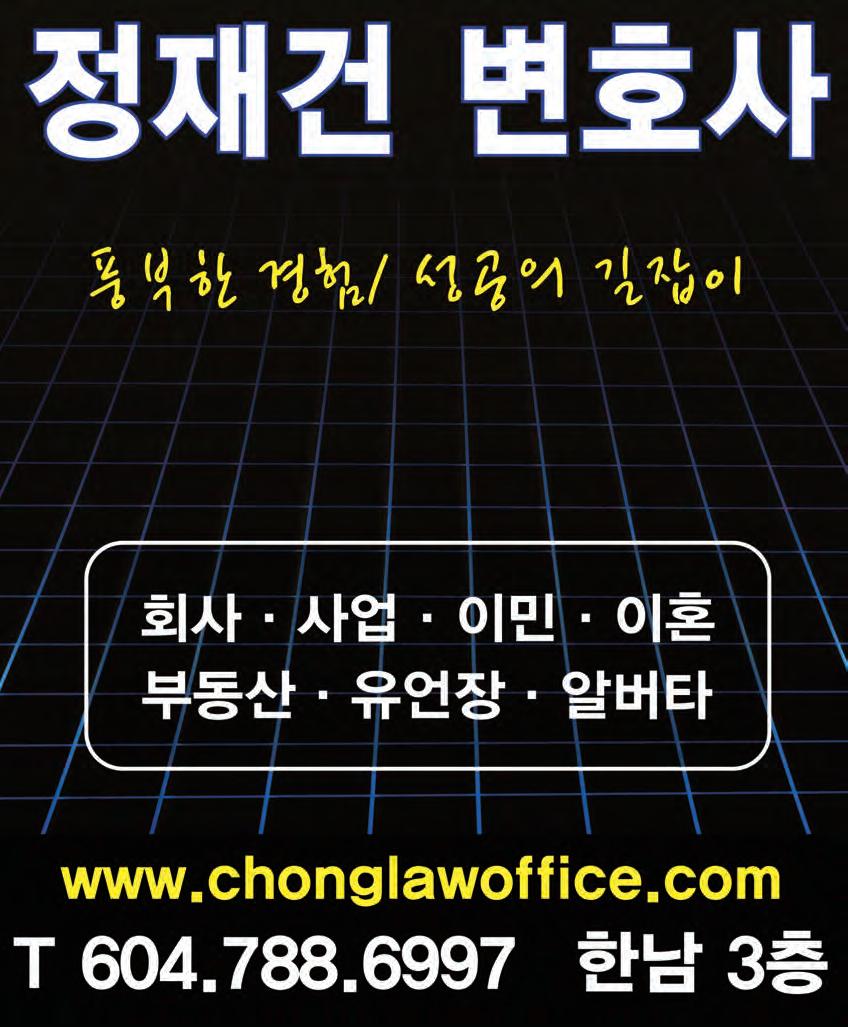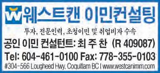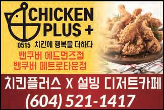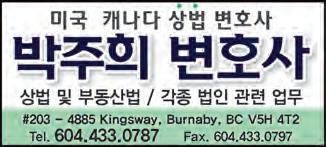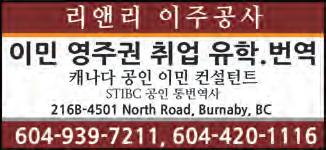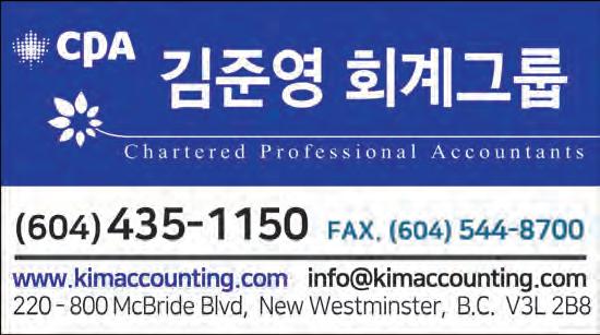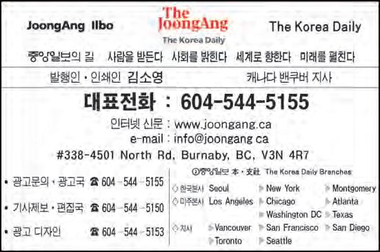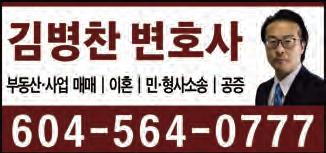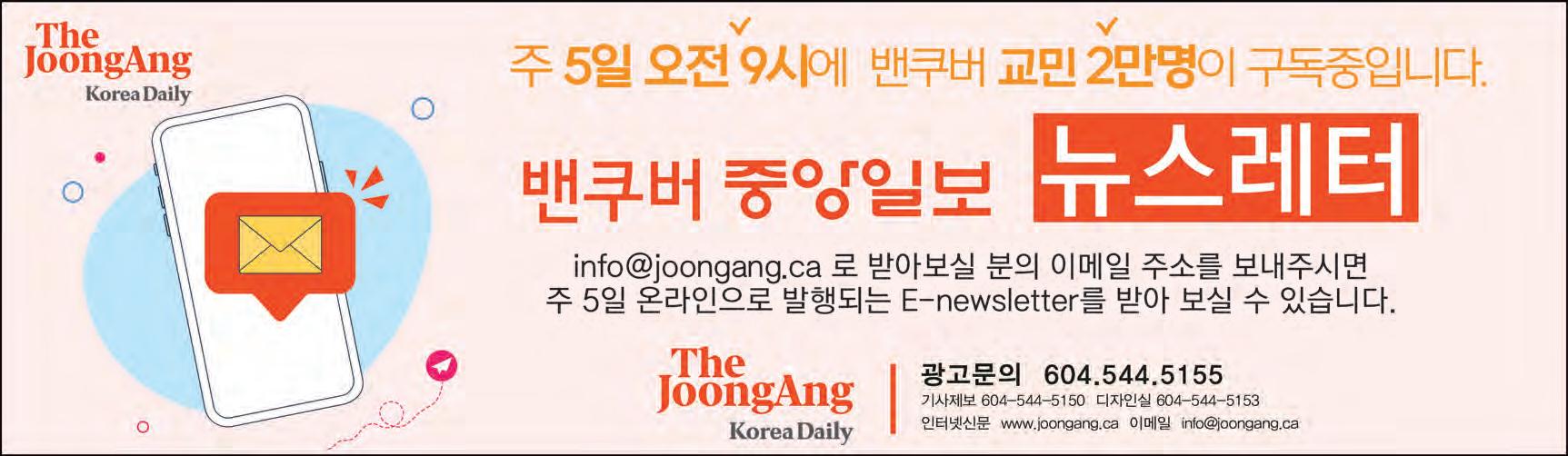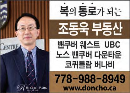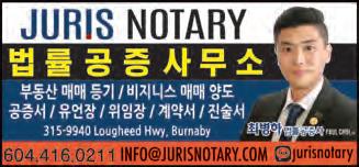 $100/월 16회 신문발행4회 &인터넷 e-중앙일보 (매주 화,수,금,토 발행) 지금 연 락하십시오 바로 내일 게재됩니다 중앙타운 & 홈페이지 업소록 광고문의 Tel. 604-544-5155 Email:ad@joongang.ca www.joinsmediacanada.com el: 604-544-5155/5150/5153 Email: ad@joongang.ca Printed on November 15th, 2022 부동산 매매 등기 / 공증서 / / 유언장 / 비지니스 매매 / / 양도위임장 / 계약서 / 진술서 604.416.0211 법률 공증사무소 최병하 법률공증사 헬스타운 비타민 쇼핑몰 OPEN gdvitamin.com 건강식품 3000여종 취급, 저렴한 가격, 한국택배까지 22년 2007-2020 15년 연속 메달리언클럽 마스터멤버 최재동부동산 Top10% of All Realtors메트로밴쿠버 William Hong, MBA T. 778-997-0427 wkhong99@yahoo.com www.williamhong.com “신중한 거래, 신중한 리얼터” 상담 604-319-6330 “올바른 학습방법, 기분좋은 학습결과” www.eliteprep.ca Junior Elite Prep Consulting 604.736.8922 604.939.6284 좋아서! 쉬워서! 스스로! 한상훈(James Han) T. 604.671.7783 하다현 AGATHA HA T. 604-505-7738 주택 융자 모기지 전문 부장 주택/자동차/비지니스/여행자 보험 외 한인종합보험(주) 유 용 규 Yong Yoo 604.803.9746 24 / 7 상담가능 604.992.2580 모기지 전문가 이 경 은 shanna.lee@rbc.com (Shanna Lee) 방정희 변호사 604.559.1470 파이오니아 법무법인 꼼꼼한 법률서비스 로 최선을 다하는 한인 1 세대 대표 로펌 박신일 법률공증사 NOTARY PUBLICSHINIL PARK 부동산 등기/사업체 양도 유언장/위임장/증언서/공증 T604.936.7275 주태근/앤디김 회계법인 회계/세무/감사/사업계획 및 상담 T. 604-936-5222 T.604 936 7777 #101-15375 102A Avenue. Surrey. BC victorcga@hotmail.com 이경수 kyungsooa@gmail.com 주거 & 상업용 매매 / 임대 / 관리 전문 “17년 경력의 전문 리얼터” 공인중개사 778-322-7942 식당/식품 가디언 한인약국 Guardian HANIN PHARMACY #201-329 North Rd, Coquitlam 604.939.7880 코퀴틀람 한인빌리지내, 한아름마트 옆 #210-1175 Johnson St, Coquitlam BC V3B 7K1 T.778 285 2804 원장 임정환 / 원장 임신영 임플란트 · 교정 · 잇몸치료 신경치료 사랑니 크라운 코퀴틀람 센터 그린 치과 오약국 · 가정의 밴쿠버 오약국 T.604-800-2250, 604-939-8311 #100-504 Cottonwood Ave. Coquitlam 이글리지 밴쿠버 한인약국 #201B-1194 Lansdowne Dr. Coquitlam 하나치과그룹 김영복 원장/임신영 원장/김경수 원장/임정환 원장 버나비 한남슈퍼 3층 310호 604-421-2804 604.428.0551 김정화 치과 진료 시간 Mon-Fri 10:00am-7:00pm Sat 10:00am-4:00pm (목,일,공휴일 휴진) 103-4501 North Rd. Burnaby BC V3N 4R7 happysmiledental7@gmail.com 웨스트캔 이민컨설팅 공인이민컨설턴트 최 주 찬 WestCan Immigration Consulting T: 604-461-0100 www.westcanimm.com #304-566 Lougheed Hwy. Coquitlam BC 최고 딜러 기술력 진정 여러분이 찾던 정비 shop Pick up & Delivery Service ▶엔진튠업 ▶쇼바 및 서스펜션 ▶마후라 수리 및 교환 ▶컴퓨터 및 각종 전기장치 ▶각종 오일 및 필터 교환 ▶엔진/밋숀 교환 및 수리 ▶브레이크 수리 및 교환 ▶타이어 교환 및 휠 밸런스 ▶에어컨 및 히터 604-430-8040 5757 Beresford St. Burnaby 604.461.4043 604.461.4040 한국어 서비스 English Service 2902 St.Johns Street, Port Moody, BC V3H 2C3 차량 수리기간 중 무료 대차 90% 이상이 고정 고객인 회사 권원식 부동산 T.604-306-6750 bkwonrealtor@gmail.com BRUCE KWON PREC 30년 오랜 경험의 전문 리얼터 레스토랑 전문, 맞춤형 부동산 비지니스 / 투자건물 / LEASE / 경매물건 남승오 부동산 Charles Nam PREC* 604.710.3897 집매매 콘도매매 부동산 투자 신규분양 권장원 DLC 모기지 Andy Kwon Suite 600, 1200 West 73rd Avenue Vancouver. BC V6P 6G5 604.785.8688 DLCmortgage www.andykwonmortgage.com 미국 캐나다 상법 변호사 상법 및 부동산법 / 각종 법인 관련 업무 T. 604.433.0787 ALL POINTS REALTY 위니박 부동산 winniepak@remax.net www.winniepark.net 604.813.8000 브라이언 최 Brian Choi 604.773.9882 뉴 스트림 리얼티 Personal Real Estate Corporation 한인 마켓 담당 팀장 (Korean Team Leader) 김영선 부동산 778.241.5555 밴쿠버 최고의 부동산 전문가 www.youngsunkim.com 건강식품/의료기 교육 학원/학교 금융 보험/은행 법률 회계사/공증/공인번역 버나비 에드먼즈 2호점 T. 604-468-2432 의료 이민/유학 자동차 부동산 가구/건축/인스팩션 Registered Clinical Counsellor, MA, MEd Tel. 778-887-7275 연우심리 상담소 延 友 심리치료 / 놀이치료 / 심리검사 / 부부상담 / 가족상담 604-492-2875 #525-329 North Rd, Coquitlam, BC 프리미엄 캐나다산 허니스틱 광고문의: 604-544-5155