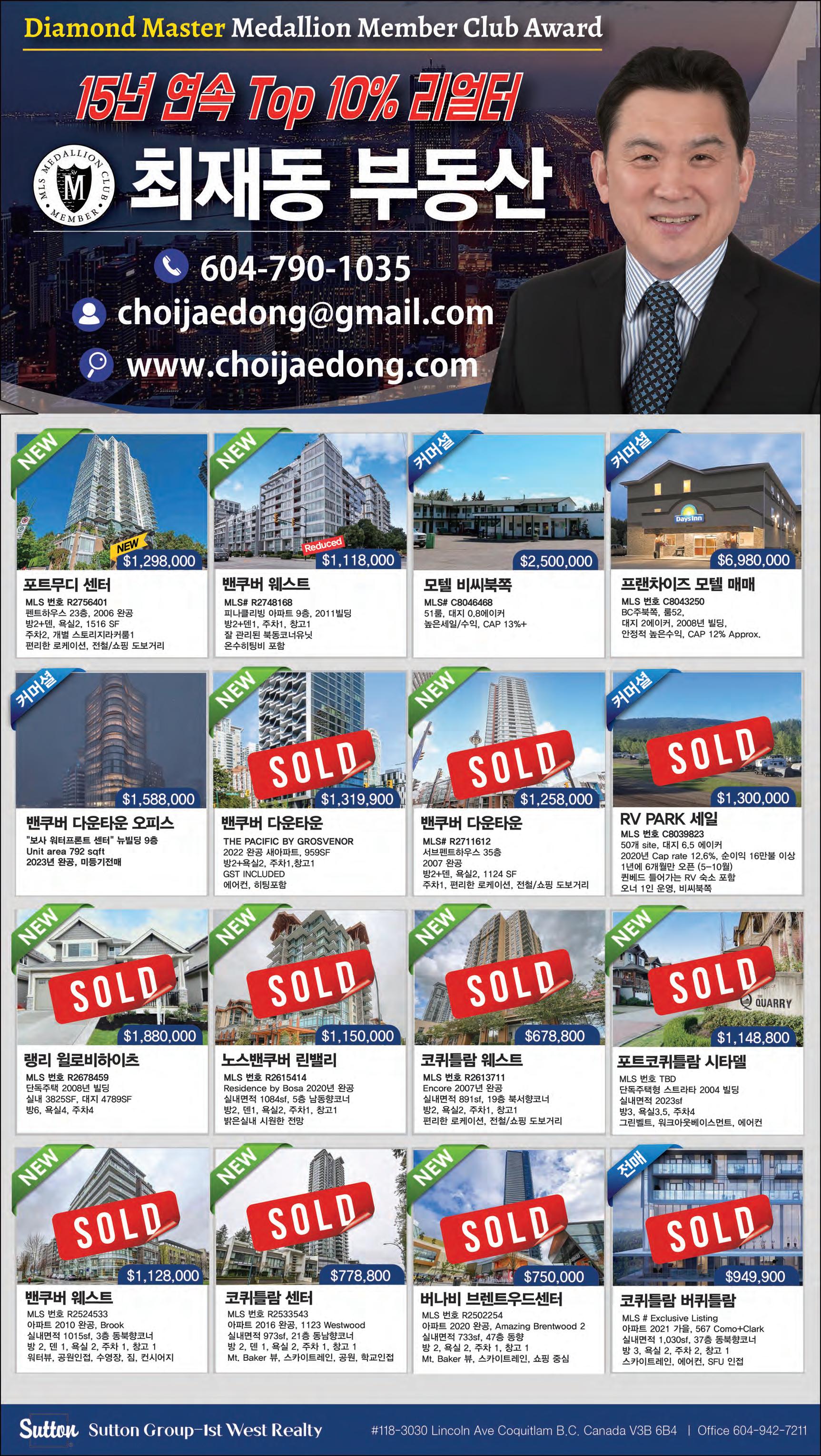 $100/월 16회 신문발행4회 &인터넷 e-중앙일보 (매주 화,수,금,토 발행) 지금 연락하십시오. 바로 내일 게재됩니 다. 중앙타운 & 홈페이지 업소록 광고문의 Tel. 604-544-5155 Ema .joinsmediacanada.com el: 604-544-5155/5150/5153 Email: ad@joongang.ca Printed on April 4th, 2023 부동산 매매 등기 / 공증서 / / 유언장 / 비지니스 매매 / / 양도위임장 / 계약서 / 진술서 604.416.0211 법률 공증사무소 최병하 법률공증사 헬스타운 비타민 쇼핑몰 OPEN gdvitamin.com 건강식품 3000여종 취급, 저렴한 가격, 한국택배까지 박보영 Bo Vancouver West 전문 [주택/아파트 “29년 경력의 전문가 22년 상담 604-319-6330 “올바른 학습방법, 기분좋은 학습결과” www.eliteprep.c a Junior Elite Prep Consulting 604.736.8922 생명보험/연금보험/교육적금 하다 현 AGATH A HA T. 6 04 -5 05 -7738 주택 융자 모기지 전문 부장 주택/자동차/비지니스/여행자 보험 외 한인종합보험(주 ) 유 용 규 Yong Yoo 604.803.9746 방정희 변호 사 604 559 147 0 파이오니아 법무법 인 꼼꼼한 법률서비 스 로 최선을 다하는 한인 1세 대 대표 로펌 주태근/앤디김 회계법인 회계/세무/감사/사업계획 및 상담 T. 604-936-5222 T. 60 4 . 93 6 . 777 7 #101-15375 102A Avenue. Surrey. BC victo rc ga@hotmail. com 식당/식품 가디언 한인약 국 Guardian HANIN PHARMACY #201-329 North Rd, Coquitlam 604.939.7880 코퀴틀람 한인빌리지내, 한아름마트 옆 #210-1175 Johnson St, Coquitlam BC V3B 7K1 T. 778 285 280 4 아씨마켓 코퀴틀람점이 있는 Jhon on과 G len 교차 몰 원장 임정환 / 원장 임신영 / 원장 김경 수 임플란트 · 교정 · 잇몸치 료 신경치료 · 사랑니 · 크라 운 코퀴틀람 센터 그린 치과 오약국 · 가정 의 밴쿠버 한인 오약국 T. 604-800-2250 604-939-831 1 #100-504 Cottonwood Ave Coquitla m 이글리지 밴쿠버 한인약국 T. 604-941-045 4 #201B-1194 L ansdowne Dr. Coquitla m 하나치과그 룹 김영복 원장 / 임신영 원장 / 김경수 원장 / 임정환 원장 www.hanin d ental. com 진료시간 : 월-금 9: 30 am~ 6pm 토 9 : 30 a m-4p m 버나비 한남슈퍼 3층 310 호 604-421-280 4 604.428.0551 김정화 치과 진료 시간 Mon-Fri 10:00am-7:00pm Sat 10:00am-4:00pm (목,일,공휴일 휴진) 103-4501 North Rd. Burnaby BC V3N 4R happysmiledental7@gmail.com 웨스트캔 이민컨설팅 공인이민컨설턴트 최 주 찬 WestCan Immigration Consulting T: 604-461-0100 www.westcanimm.com #304-566 Lougheed Hwy. Coquitlam BC 최고 딜러 기술력 진정 여러분이 찾던 정비 shop Pick up & Delivery Service ▶엔진튠업 ▶쇼바 및 서스펜션 ▶마후라 수리 및 교환 ▶컴퓨터 및 각종 전기장치 ▶각종 오일 및 필터 교환 ▶엔진/밋숀 교환 및 수리 ▶브레이크 수리 및 교환 ▶타이어 교환 및 휠 밸런스 ▶에어컨 및 히터 604-430-8040 5757 Be ford St. Bu by 604.461.4043 604.461.4040 한국어 서비스 English Service 2902 St.Johns Street, Port Moody, BC V3H 2C3 차량 수리기간 중 무료 대차 90% 이상이 고정 고객인 회사 권원 식 부동산 T.604-306-6750 bkwonrealtor@gmail.com BRUCE KWON PREC 30년 오랜 경험의 전문 리얼터 레스토랑 전문, 맞춤형 부동산 비지니스 / 투자건물 / LEASE / 경매물건 남승오 부동산 C harl es Nam P REC* 604.710.3897 집매매 콘도매매 부동산 투자 신규분양 미국 캐나다 상법 변호 사 상법 및 부동산법 / 각종 법인 관련 업무 T. 604.433.0787 ALL POINTS REALTY 위니박 부동산 winniepak@remax.net www.winniepark.net 604.813.800 0 김영선 부동산 778.241.5555 밴쿠버 최고의 부동산 전문가 www.youngsunkim.com 건강식품/의료기 교육 학원/학교 금융 보험/은행 법률 회계사/공증/공인번역 버나비 에드먼즈 2호점 T. 604-468-2432 의료 이민/유학 자동차 부동산 가구/건축/인스팩션 Registered Clinical Counsellor, MA, MEd Tel. 778-887-7275 연우심리 상담소 延 友 심리치료 / 놀이치료 / 심리검사 / 부부상담 / 가족상담 604-492-2875 #525-329 North Rd, Coquitlam, BC Tel. 604-992-2580 모 기 지 전 문 가 이경은 광고문의: 604-544-5155 82-2-549-5993 해외투자이민 전문기업 클럽이민과 상담하세요 모기지 실적 1위 604.319.8080 도승준
