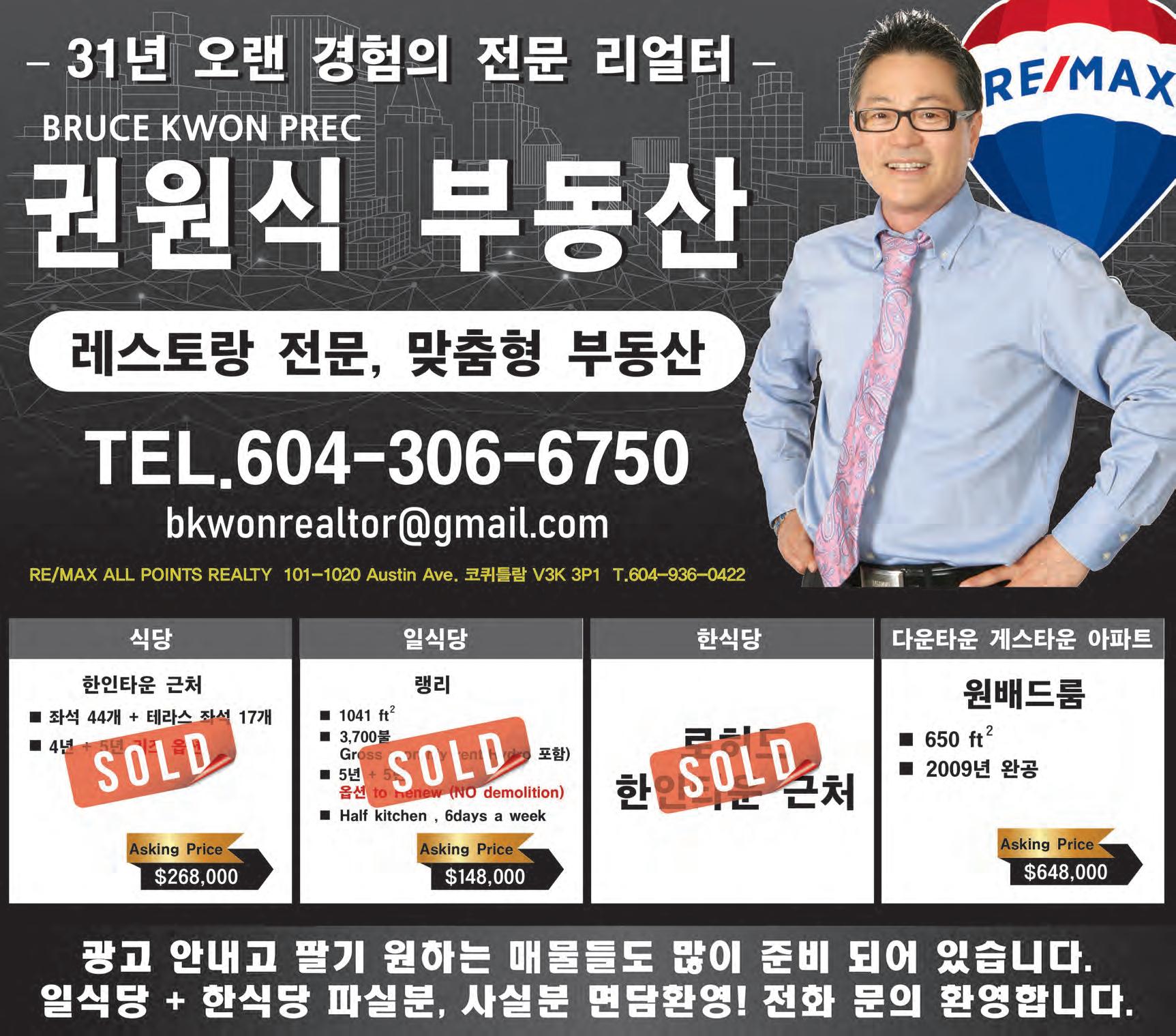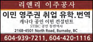 $100/월 16회 신문발행4회 &인터넷 e-중앙일보 (매주 화,수,금,토 발행) 지금 연락하 십시오 바로 내일 게재됩니다 중앙타운 & 홈페이지 업소록 광고문의 Tel. 604-544-5155 Email:ad@joongang.ca www.joinsmediacanada.com el: 604-544-5155/5150/5153 Email: ad@joongang.ca Printed on October 28th, 2022 부동산 매매 등기 / 공증서 / / 유언장 / 비지니스 매매 / / 양도위임장 / 계약서 / 진술서 604.416.0211 법률 공증사무소 최병하 법률공증사 헬스타운 비타민 쇼핑몰 OPEN gdvitamin.com 건강식품 3000여종 취급, 저렴한 가격, 한국택배까지 22년 2007-202015년 연속 메달리언클럽 마스터멤버 최재동부동산 Top10% of All Realtors메트로밴쿠버 William Hong, MBA T. 778-997-0427 wkhong99@yahoo.com www.williamhong.com “신중한 거래, 신중한 리얼터” 상담 604-319-6330 “올바른 학습방법, 기분좋은 학습결과” www.eliteprep.ca Junior Elite Prep Consulting 604.736.8922 604.939.6284 좋아서! 쉬워서! 스스로! 한상훈(James Han) T. 604.671.7783 하다현 AGATHA HA T. 604-505-7738 주택 융자 모기지 전문 부장 주택/자동차/비지니스/여행자 보험 외 한인종합보험(주) 유 용 규 Yong Yoo 604.803.9746 24 / 7 상담가능 604.992.2580 모기지 전문가 이 경 은 shanna.lee@rbc.com (Shanna Lee) 방정희 변호사 604.559.1470 파이오니아 법무법인 꼼꼼한 법률서비스 로 최선을 다하는 한인 1 세대 대표 로펌 박신일 법률공증사 NOTARY PUBLICSHINIL PARK 부동산 등기/사업체 양도 유언장/위임장/증언서/공증 T604.936.7275 주태근/앤디김 회계법인 회계/세무/감사/사업계획 및 상담 T. 604-936-5222 T.604 936 7777 #101-15375 102A Avenue. Surrey. BC victorcga@hotmail.com 이경수 kyungsooa@gmail.com 주거 & 상업용 매매 / 임대 / 관리 전문 “17년 경력의 전문 리얼터” 공인중개사 778-322-7942 식당/식품 가디언 한인약국 Guardian HANIN PHARMACY #201-329 North Rd, Coquitlam 604.939.7880 코퀴틀람 한인빌리지내, 한아름마트 옆 #210-1175 Johnson St, Coquitlam BC V3B 7K1 T.778 285 2804 원장 임정환 / 원장 임신영 임플란트 · 교정 · 잇몸치료 신경치료 사랑니 크라운 코퀴틀람 센터그린 치과 오약국 · 가정의 밴쿠버 오약국 T.604-800-2250, 604-939-8311 #100-504 Cottonwood Ave. Coquitlam 이글리지 밴쿠버 한인약국 #201B-1194 Lansdowne Dr. Coquitlam 하나치과그룹 김영복 원장/임신영 원장/김경수 원장/임정환 원장 버나비 한남슈퍼 3층 310호 604-421-2804 604.428.0551 김정화 치과 진료 시간 Mon-Fri 10:00am-7:00pm Sat 10:00am-4:00pm (목,일,공휴일 휴진) 103-4501 North Rd. Burnaby BC V3N 4R7 happysmiledental7@gmail.com 웨스트캔 이민컨설팅 공인이민컨설턴트 최 주 찬 WestCan Immigration Consulting T: 604-461-0100 www.westcanimm.com #304-566 Lougheed Hwy. Coquitlam BC 최고 딜러 기술력 진정 여러분이 찾던 정비 shop Pick up & Delivery Service ▶엔진튠업 ▶쇼바 및 서스펜션 ▶마후라 수리 및 교환 ▶컴퓨터 및 각종 전기장치 ▶각종 오일 및 필터 교환 ▶엔진/밋숀 교환 및 수리 ▶브레이크 수리 및 교환 ▶타이어 교환 및 휠 밸런스 ▶에어컨 및 히터 604-430-8040 5757 Beresford St. Burnaby 604.461.4043 604.461.4040 한국어 서비스 English Service 2902 St.Johns Street, Port Moody, BC V3H 2C3 차량 수리기간 중 무료 대차 90% 이상이 고정 고객인 회사 권원식 부동산 T.604-306-6750 bkwonrealtor@gmail.com BRUCE KWON PREC 30년 오랜 경험의 전문 리얼터 레스토랑 전문, 맞춤형 부동산 비지니스 / 투자건물 / LEASE / 경매물건 남승오 부동산 Charles Nam PREC* 604.710.3897 집매매 콘도매매 부동산 투자 신규분양 권장원 DLC 모기지 Andy Kwon Suite 600, 1200 West 73rd Avenue Vancouver. BC V6P 6G5 604.785.8688 DLCmortgage www.andykwonmortgage.com 미국 캐나다 상법 변호사 상법 및 부동산법 / 각종 법인 관련 업무 T. 604.433.0787 ALL POINTS REALTY 위니박 부동산 winniepak@remax.net www.winniepark.net 604.813.8000 브라이언 최 Brian Choi 604.773.9882 뉴 스트림 리얼티 Personal Real Estate Corporation 한인 마켓 담당 팀장 (Korean Team Leader) 김영선 부동산 778.241.5555 밴쿠버 최고의 부동산 전문가 www.youngsunkim.com 건강식품/의료기 교육 학원/학교 금융 보험/은행 법률 회계사/공증/공인번역 버나비 에드먼즈 2호점 T. 604-468-2432 의료 이민/유학 자동차 부동산 가구/건축/인스팩션 Registered Clinical Counsellor, MA, MEd Tel. 778-887-7275 연우심리 상담소延 友 심리치료 / 놀이치료 / 심리검사 / 부부상담 / 가족상담 604-492-2875 #525-329 North Rd, Coquitlam, BC 프리미엄 캐나다산 허니스틱 광고문의: 604-544-5155