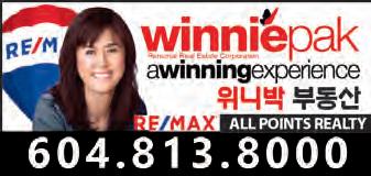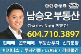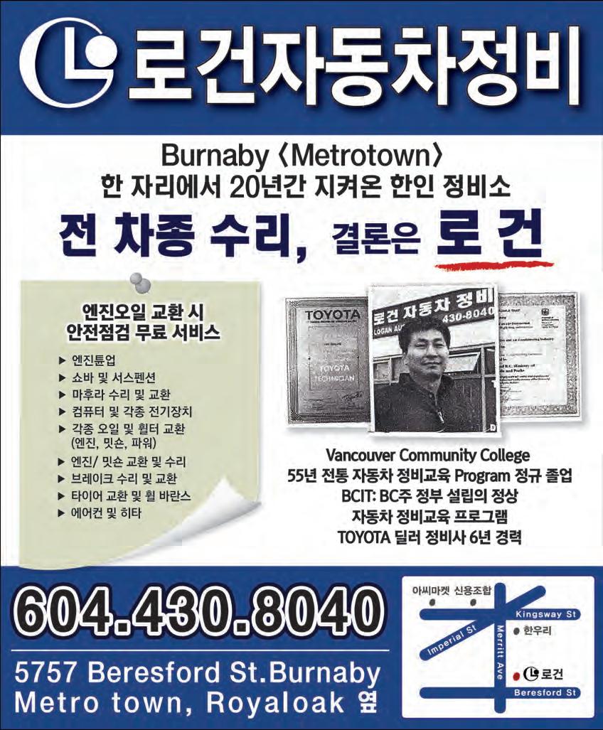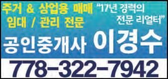 $100/월 16회 신문발행4회 &인터넷 e-중앙일보 (매주 화,수,금,토 발행) 지금 연락하십시오 바로 내일 게재됩니다 중앙타운 & 홈페이지 업소록 광고문의 Tel. 604-544-5155 Email:ad@joongang.ca www.joinsmediacanada.com el: 604-544-5155/5150/5153 Email: ad@joongang.ca Printed on November 23rd, 2022 부동산 매매 등기 / 공증서 / / 유언장 / 비지니스 매매 / / 양도위임장 / 계약서 / 진술서 604.416.0211 법률 공증사무소 최병하 법률공증사 헬스타운 비타민 쇼핑몰 OPEN gdvitamin.com 건강식품 3000여종 취급, 저렴한 가격, 한국택배까지 22년 2007-2020 15년 연속 메달리언클럽 마스터멤버 최재동부동산 Top10% of All Realtors메트로밴쿠버 William Hong, MBA T. 778-997-0427 wkhong99@yahoo.com www.williamhong.com “신중한 거래, 신중한 리얼터” 상담 604-319-6330 “올바른 학습방법, 기분좋은 학습결과” www.eliteprep.ca Junior Elite Prep Consulting 604.736.8922 604.939.6284 좋아서! 쉬워서! 스스로! 한상훈(James Han) T. 604.671.7783 하다현 AGATHA HA T. 604-505-7738 주택 융자 모기지 전문 부장 주택/자동차/비지니스/여행자 보험 외 한인종합보험(주) 유 용 규 Yong Yoo 604.803.9746 24 / 7 상담가능 604.992.2580 모기지 전문가 이 경 은 shanna.lee@rbc.com (Shanna Lee) 방정희 변호사 604.559.1470 파이오니아 법무법인 꼼꼼한 법률서비스 로 최선을 다하는 한인 1 세대 대표 로펌 박신일 법률공증사 NOTARY PUBLICSHINIL PARK 부동산 등기/사업체 양도 유언장/위임장/증언서/공증 T604.936.7275 주태근/앤디김 회계법인 회계/세무/감사/사업계획 및 상담 T. 604-936-5222 T.604 936 7777 #101-15375 102A Avenue. Surrey. BC victorcga@hotmail.com 이경수 kyungsooa@gmail.com 주거 & 상업용 매매 / 임대 / 관리 전문 “17년 경력의 전문 리얼터” 공인중개사 778-322-7942 식당/식품 가디언 한인약국 Guardian HANIN PHARMACY #201-329 North Rd, Coquitlam 604.939.7880 코퀴틀람 한인빌리지내, 한아름마트 옆 #210-1175 Johnson St, Coquitlam BC V3B 7K1 T.778 285 2804 원장 임정환 / 원장 임신영 임플란트 · 교정 · 잇몸치료 신경치료 사랑니 크라운 코퀴틀람 센터 그린 치과 오약국 · 가정의 밴쿠버 오약국 T.604-800-2250, 604-939-8311 #100-504 Cottonwood Ave. Coquitlam 이글리지 밴쿠버 한인약국 #201B-1194 Lansdowne Dr. Coquitlam 하나치과그룹 김영복 원장/임신영 원장/김경수 원장/임정환 원장 버나비 한남슈퍼 3층 310호 604-421-2804 604.428.0551 김정화 치과 진료 시간 Mon-Fri 10:00am-7:00pm Sat 10:00am-4:00pm (목,일,공휴일 휴진) 103-4501 North Rd. Burnaby BC V3N 4R7 happysmiledental7@gmail.com 웨스트캔 이민컨설팅 공인이민컨설턴트 최 주 찬 WestCan Immigration Consulting T: 604-461-0100 www.westcanimm.com #304-566 Lougheed Hwy. Coquitlam BC 최고 딜러 기술력 진정 여러분이 찾던 정비 shop Pick up & Delivery Service ▶엔진튠업 ▶쇼바 및 서스펜션 ▶마후라 수리 및 교환 ▶컴퓨터 및 각종 전기장치 ▶각종 오일 및 필터 교환 ▶엔진/밋숀 교환 및 수리 ▶브레이크 수리 및 교환 ▶타이어 교환 및 휠 밸런스 ▶에어컨 및 히터 604-430-8040 5757 Beresford St. Burnaby 604.461.4043 604.461.4040 한국어 서비스 English Service 2902 St.Johns Street, Port Moody, BC V3H 2C3 차량 수리기간 중 무료 대차 90% 이상이 고정 고객인 회사 권원식 부동산 T.604-306-6750 bkwonrealtor@gmail.com BRUCE KWON PREC 30년 오랜 경험의 전문 리얼터 레스토랑 전문, 맞춤형 부동산 비지니스 / 투자건물 / LEASE / 경매물건 남승오 부동산 Charles Nam PREC* 604.710.3897 집매매 콘도매매 부동산 투자 신규분양 권장원 DLC 모기지 Andy Kwon Suite 600, 1200 West 73rd Avenue Vancouver. BC V6P 6G5 604.785.8688 DLCmortgage www.andykwonmortgage.com 미국 캐나다 상법 변호사 상법 및 부동산법 / 각종 법인 관련 업무 T. 604.433.0787 ALL POINTS REALTY 위니박 부동산 winniepak@remax.net www.winniepark.net 604.813.8000 브라이언 최 Brian Choi 604.773.9882 뉴 스트림 리얼티 Personal Real Estate Corporation 한인 마켓 담당 팀장 (Korean Team Leader) 김영선 부동산 778.241.5555 밴쿠버 최고의 부동산 전문가 www.youngsunkim.com 건강식품/의료기 교육 학원/학교 금융 보험/은행 법률 회계사/공증/공인번역 버나비 에드먼즈 2호점 T. 604-468-2432 의료 이민/유학 자동차 부동산 가구/건축/인스팩션 Registered Clinical Counsellor, MA, MEd Tel. 778-887-7275 연우심리 상담소 延 友 심리치료 / 놀이치료 / 심리검사 / 부부상담 / 가족상담 604-492-2875 #525-329 North Rd, Coquitlam, BC 프리미엄 캐나다산 허니스틱 광고문의: 604-544-5155
