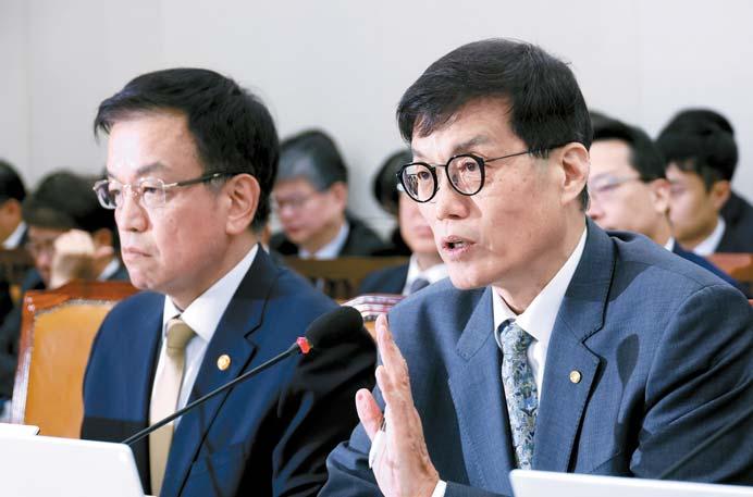 이창용한국은행총재가29일국회에서열린기획재정위원회의한국은행등에대한국정감사에 서의원질의에답하고있다.왼쪽은최상목경제부총리겸기획재정부장관. [뉴시스]