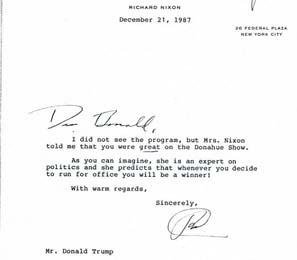 닉슨은 처음부터 트럼프가 정치가 로 성공할 것을 예견했다. 87년 12월, 닉 슨은 편지에 “내 아내가 트럼프 당신이 ‘도너휴 쇼’(MSNBC의 유명 토크쇼)