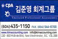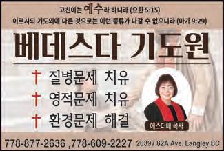 부동 / / 산 매매 등기 / 공증서 / 유언장 / 비지니스 매매 / 양도위임장 / 계약서 / 진술서 604.416.0211 법률 공증사무소 최병하 법률공증사 헬스타운 비타민 쇼핑몰 OPEN gdvitamin.com 건강식품 3000여종 취급, 저렴한 가격, 한국택배까지 박보영 B Vancouver West 전문 “30년 경력의 전문가 www.bopark.ca 22년 상담 604-319-6330 “올바른 학습방법, 기분좋은 학습결과” www.eliteprep. ca Junior Elite Prep Consulting 604.736.8922 하다현 AGATHA HA T 604-505-7738 주택 융자 모기지 전문 부장 ) 주택/자동차/비지니스/여행자 보험 외 한인종합보험( 주 유 용 규 ong o 604.803.9746 YYo #���-����� ���A Avenue. Surrey. BC victorcga@hotmail.com 식당/식품 #210-1175 Johnson St, Coquitlam BC V3B 7K1 T. 778 285 28 04 아씨마 켓 코퀴틀람점 이 있는 Jho 과 Glen 교차몰 원장 임정 환 / 원장 임신 영 / 원장 김경수 임플란 트 · 교정 · 잇몸 치료 신경치 료 · 사랑 니 · 크라운 코퀴틀람 센터 그린 치과 오약 국 · 가정의 밴쿠 버 한인 오약 국 T 604-800-225 #100-50 4 Cottonwood 이글리 지 밴쿠 버 한인약 #201B-119 4 La nsdowne Dr 103- by BC V3N 4R7 최고 딜러 기술력 진정 여러분이 찾던 정비 sh Pick up & Delivery Se ▶엔진튠업 ▶쇼바 및 서스펜션 ▶마후라 수리 및 교환 ▶컴퓨터 및 각종 전기장치 ▶각종 오일 및 필터 교환 ▶엔진/밋숀 교환 및 수 ▶브레이크 수리 및 교환 ▶타이어 교환 및 휠 밸 ▶에어컨 및 히터 604-430-8040 5757 B ford St. B rnaby 서스 Enlish Srv 604.461.4043 604.461.4040 한국어비 geice 2902 St.Johns Street, Port Moody, BC V3H 2C3 차량 수리기간 중 무료 대차 90% 이상이 고정 고객인 회사 권원식 부동산 T.604-306-6750 bkwonrealtor@gmail.com BRUCE KWON PREC 30년 오랜 경험의 전문 리얼터 레스토랑 전문, 맞춤형 부동산 김영선 부동산 778.241.5555 밴쿠버 최고의 부동산 전문가 www.youngsunkim.com 건강식품/의료기 교육 학원/학교 금융 보험/은행 법률 회계사/공증/공인번역 버나비 에드먼즈 2호점 T. 604-468-2432 의료 M Registe red Clinical C ounsellor, M A, Ed Tel. 778-887-7275 연우심리 상담소 延 友 심리치료 / 놀이치료 / 심리검사 / 부부상담 / 가족상담 604-492-2875 #525-329 North Rd, Coquitlam, BC Tel. 604-992-2580 모 기 지 전 문 가 이경은 모기지 실적 1위 604.319.8080 도승준 모기지 사업대출 전 문 크리스 김 한인 빌리지 One stop으로 모든 쇼핑이 가능한 복합쇼핑몰 대표번호 : 604-544-5155 밴쿠버 중앙일보 5 박신일 법률공증사 NOTARY PUBLICSHINIL PARK 부동산 등기/사업체 양도 유언장/위임장/증언서/공증 T604.936.72 7 한상훈(James Han) T. 604.671.7783 코퀴틀람 지점 ��� ��� ���� 다운타운 지점 ��� ��� ���� 캐나다 미국 캐나다 상법 변 호사 상법 및 부동산법 /각종 법인 관련 업무 T.