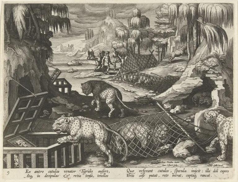 Leopard hunting with mirrors. Venationes Ferarum, avium, piscium pugnae Bestiariorum. Jan Collaert II after Jan van der Straet, 1594-1598.
